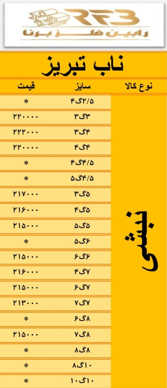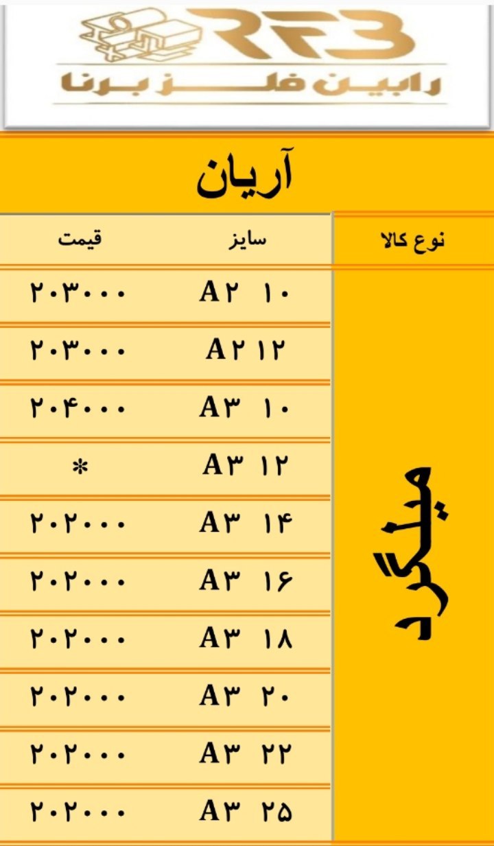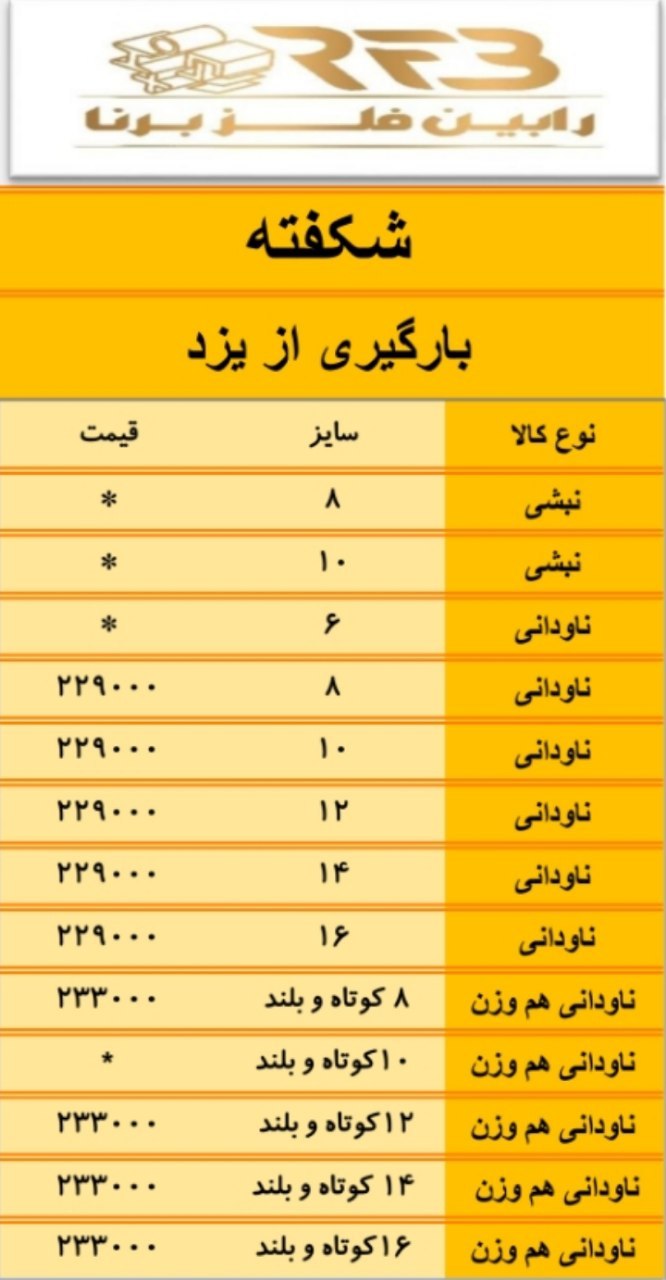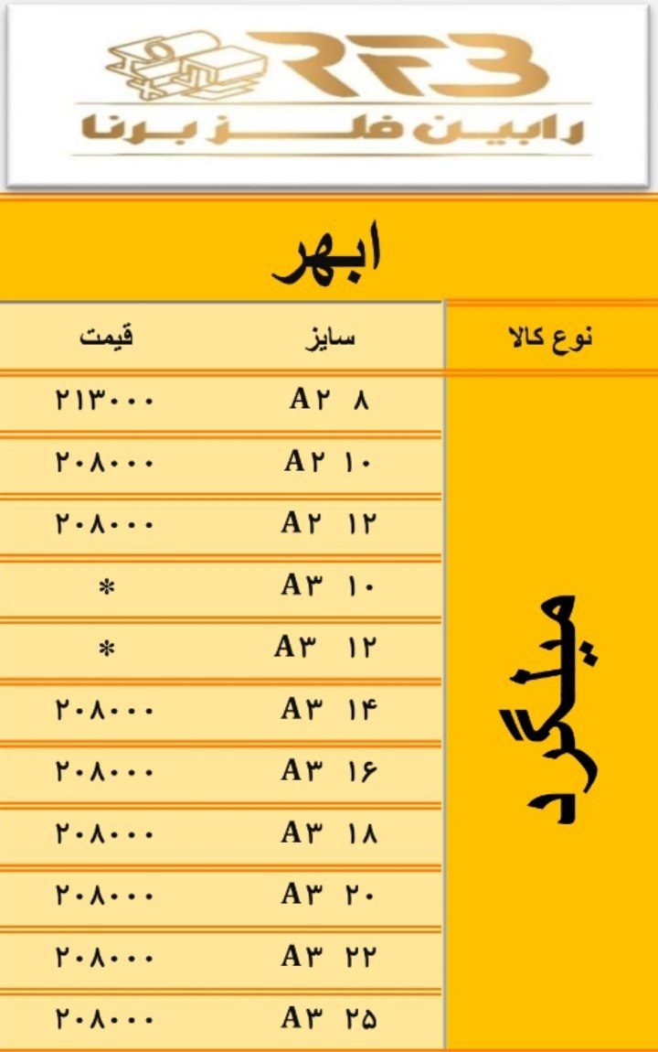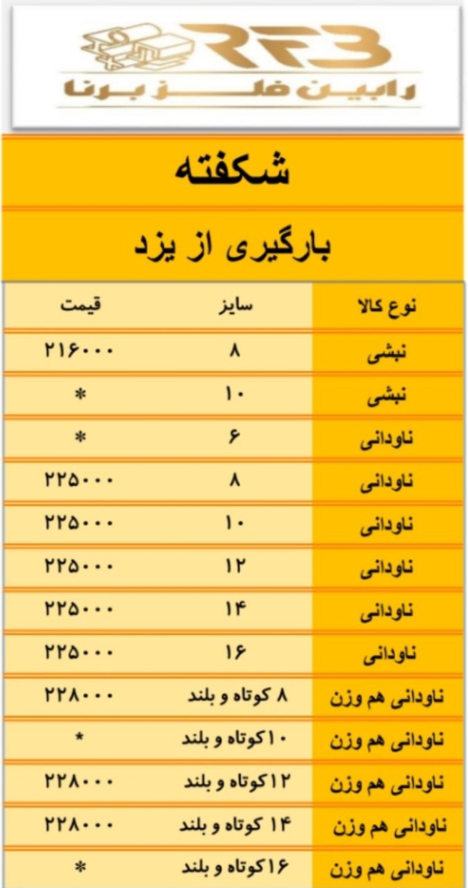 #ضايعاتذوبی 1-روغنی نرمه 14250 2-روغنی ضخیم 14250 3-روغنی ریزبار و پولکی 14250 4-گالوانيزه و ورق روكشدار خودرويي 14000 5-سوپر ويژه 14000 6-كلاف 13950 7-ويژه 1 ...