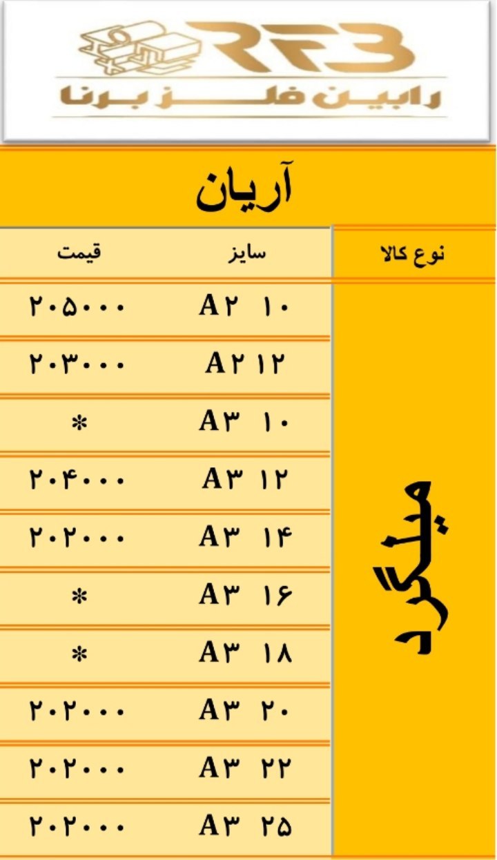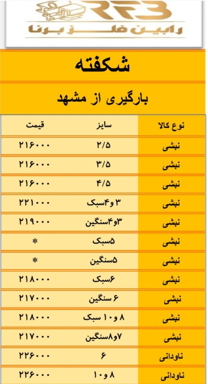#ضایعاتذوبی 1-روغنی نرمه 14050 2-روغنی ضخیم 14050 3-روغنی ریزبار و پولکی 14050 4-گالوانيزه و ورق روكشدار خودرويي 13500 5-سوپر ويژه 13500 6-كلاف 13450 7-ويژه 1 ...