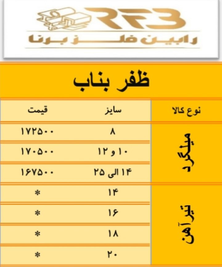 لیست موجودی و قیمت میلگرد ظفر بناب