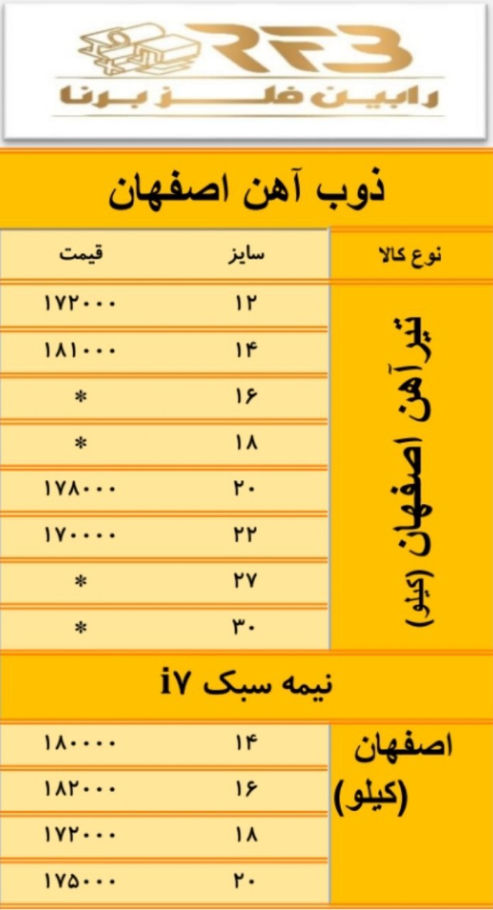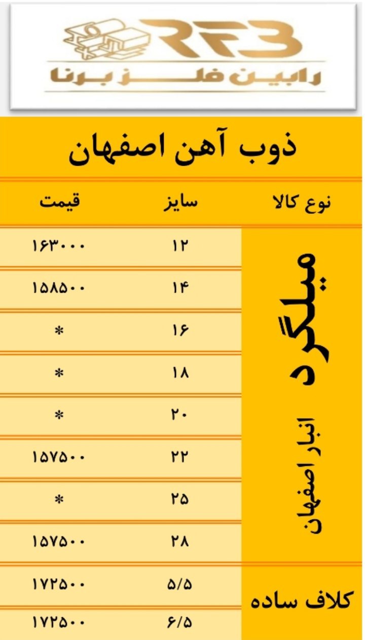 🔅رابــیــن فــلــز 🔅 #راد_همدان میلگرد ۸ ۱۶۰۰۵۰ ميلگرد ۱۰ ۱۵۷۵۵۰ ميلگرد ۱۲ ۱۵۵۰۵۰ میلگرد ۱۴الی۲۲ ۱۵۴۰۵۰ میلگرد ۲۵و ۲۸ … #افزایش_قیمت ۲۵۰۰ریالی #راد_همدان میل ...