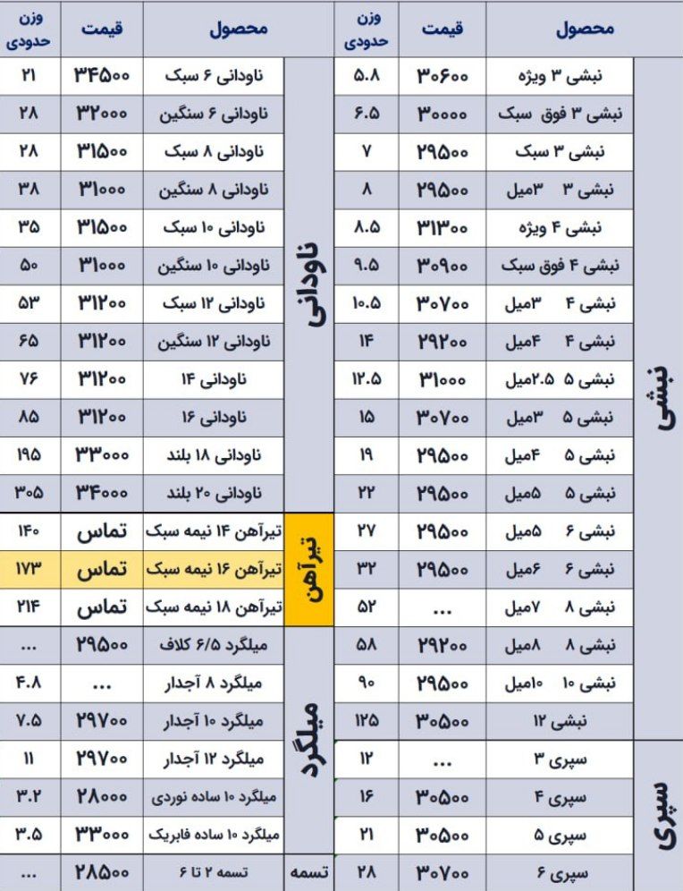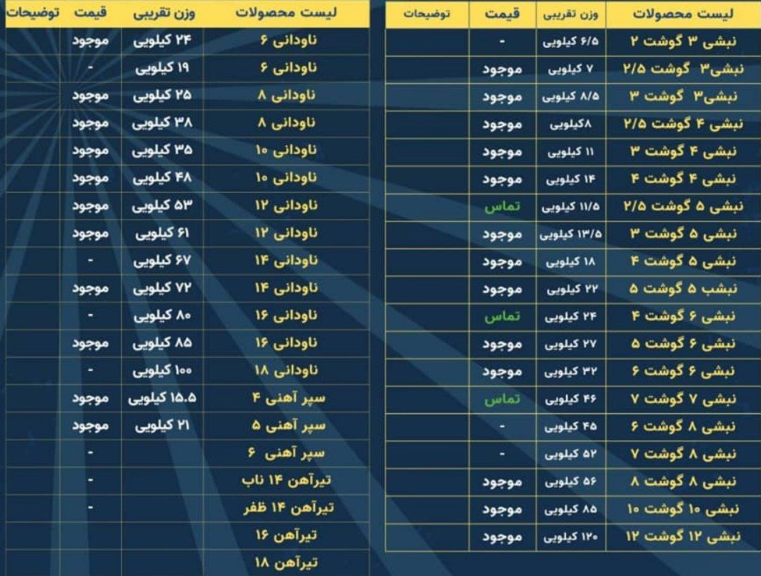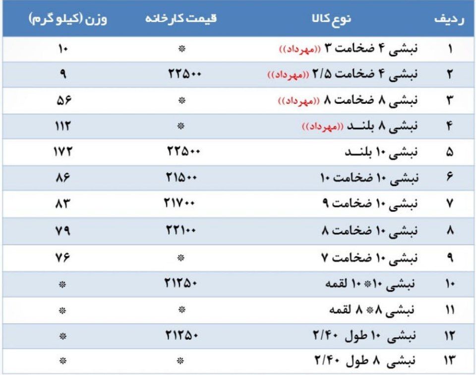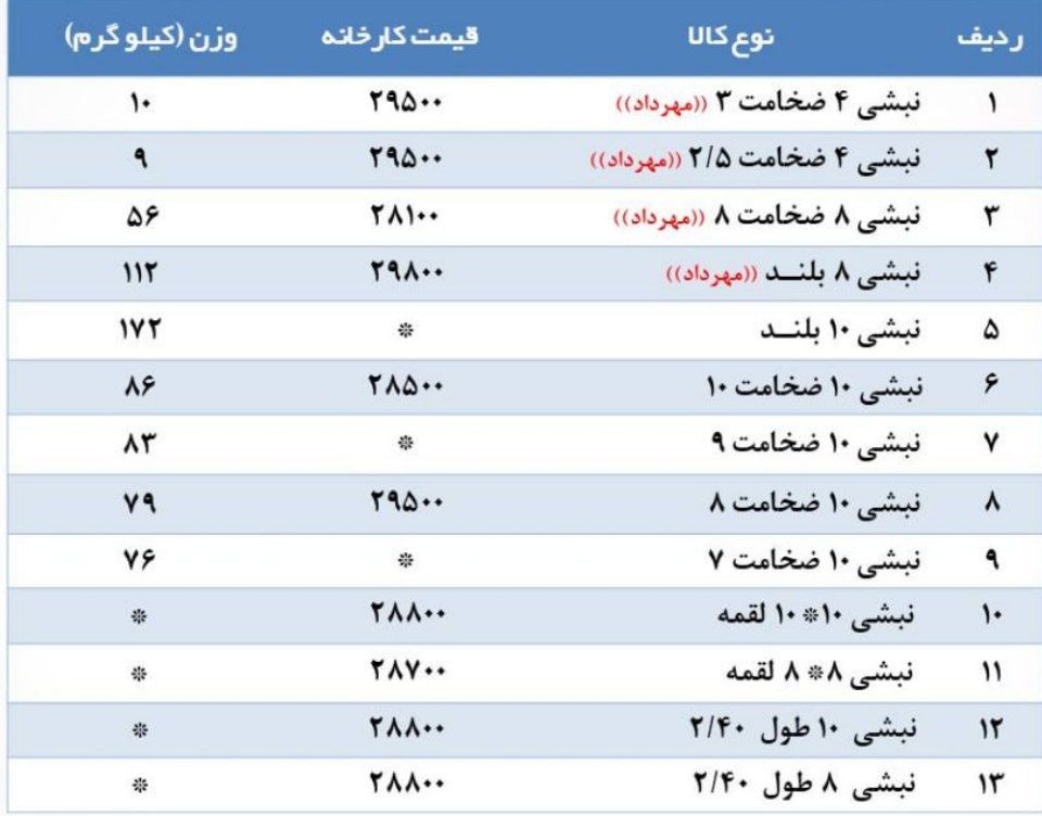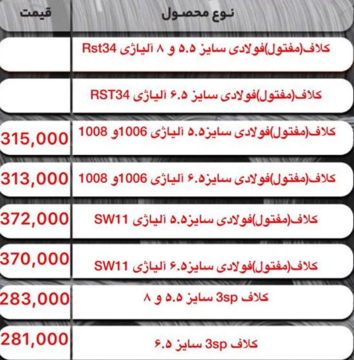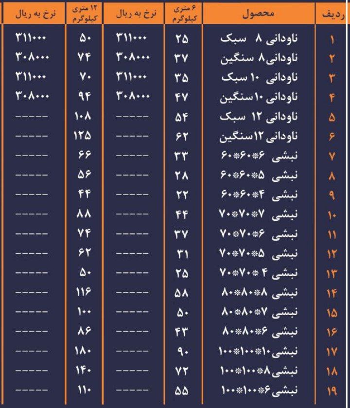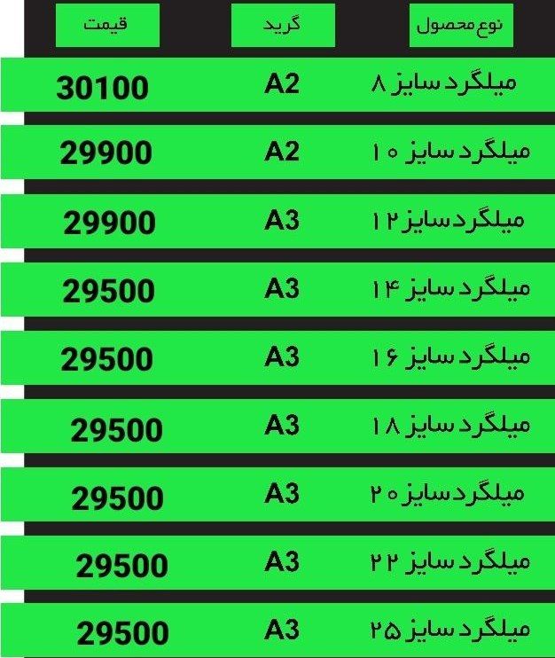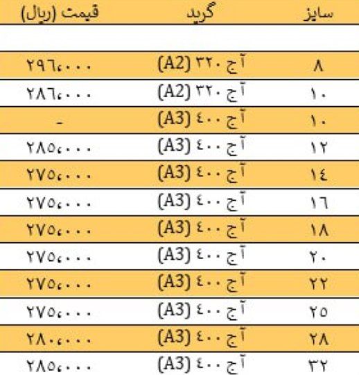 فولاد راد همدانسایز8 👈 281250سایز 10 👈278250 سایز12 👈 274250سایز14 👈 272250 سایز16 👈 272250 سایز18 👈 272250 سایز20 👈 272250 سایز ...