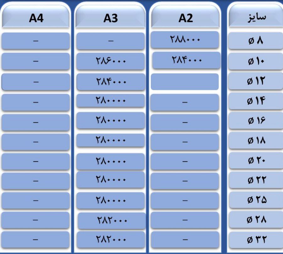 يلگرد آجدار A2سایز ۸ : ۳۵۱۰۰۰ ميلگرد آجدار A2سايز ١٠ : ۳۴۹۰۰۰ میلگرد آجدار A3 سایز ۱۲: ۳۴۷۰۰۰ میلگرد آجدار A ...