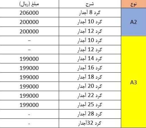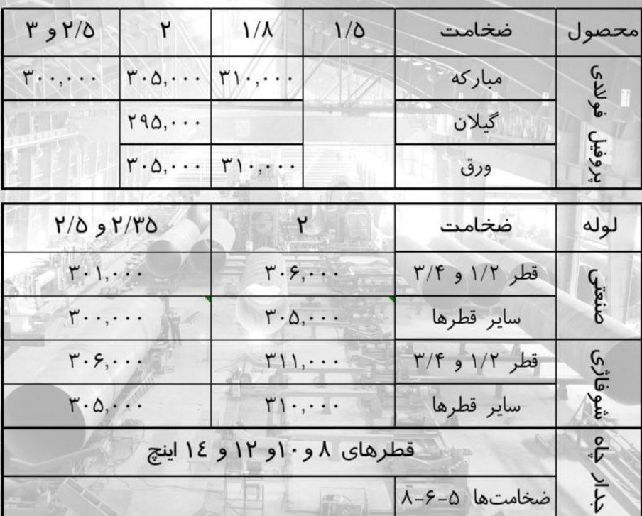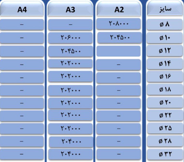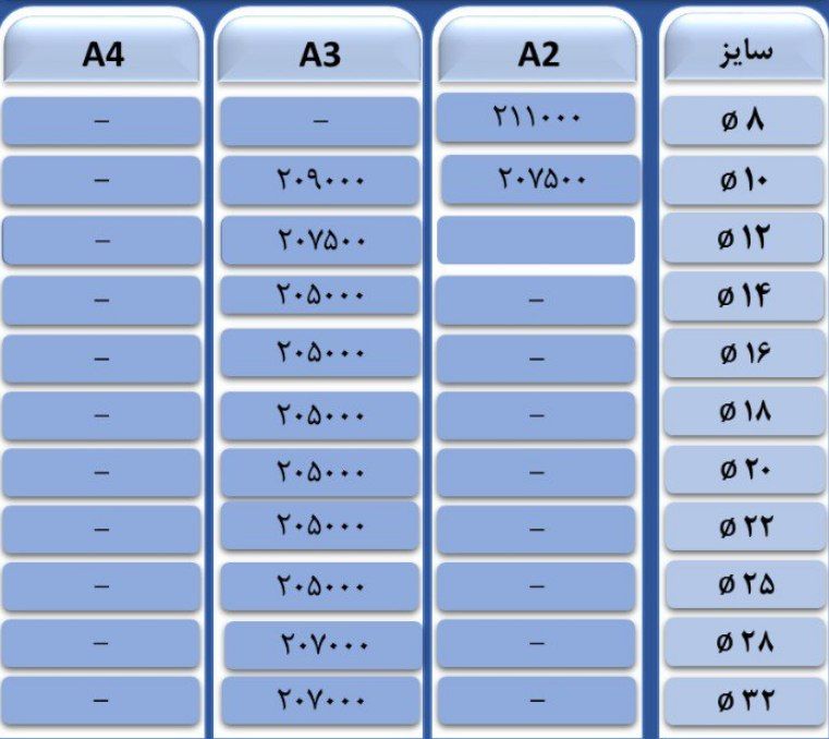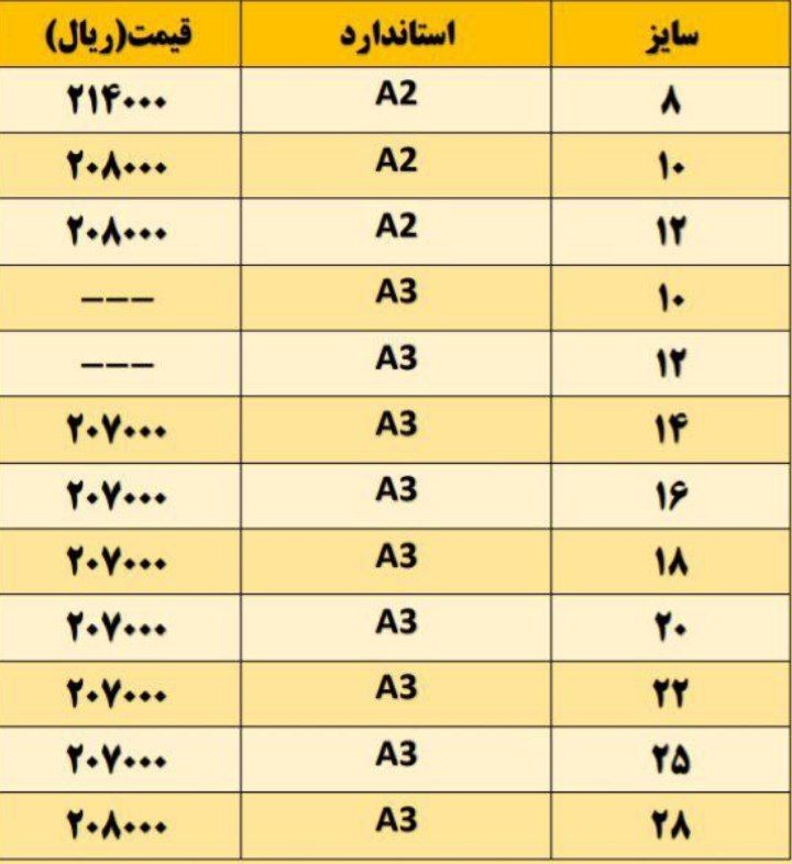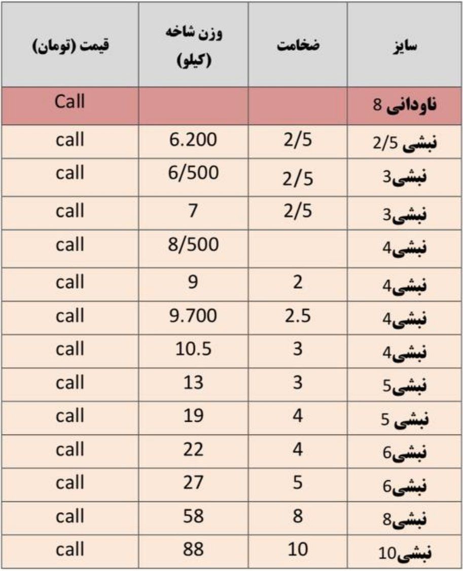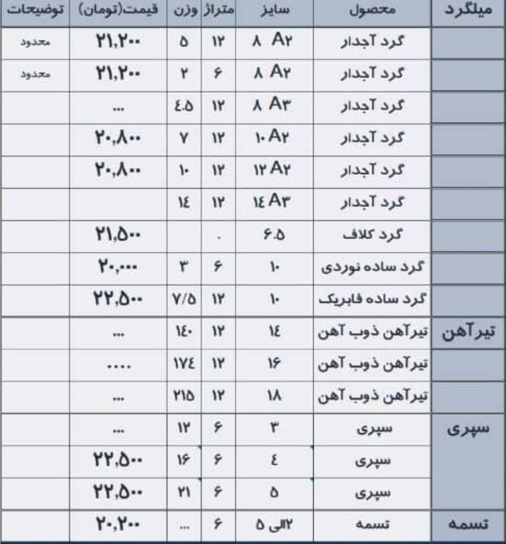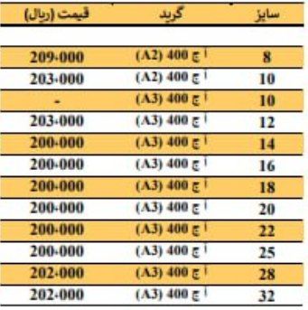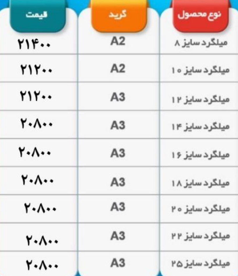 فولاد راد همدانسایز8 👈 218850سایز 10 👈 216350 سایز12 👈 212850سایز14 👈 211850 سایز16 👈 211850 سایز18 👈 211850 سایز20 👈 211850 سا ...