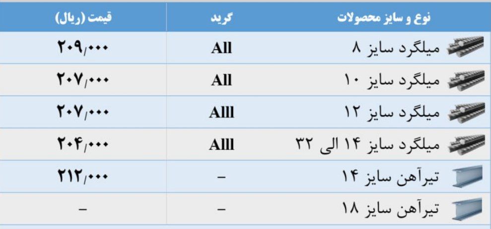 فولاد راد همدان سایز8 👈 216850سایز 10 👈 214350 سایز12 👈 210850سایز14 👈 209850 سایز16 👈 209850 سایز18 👈 209850 سایز20 👈 209850 ...