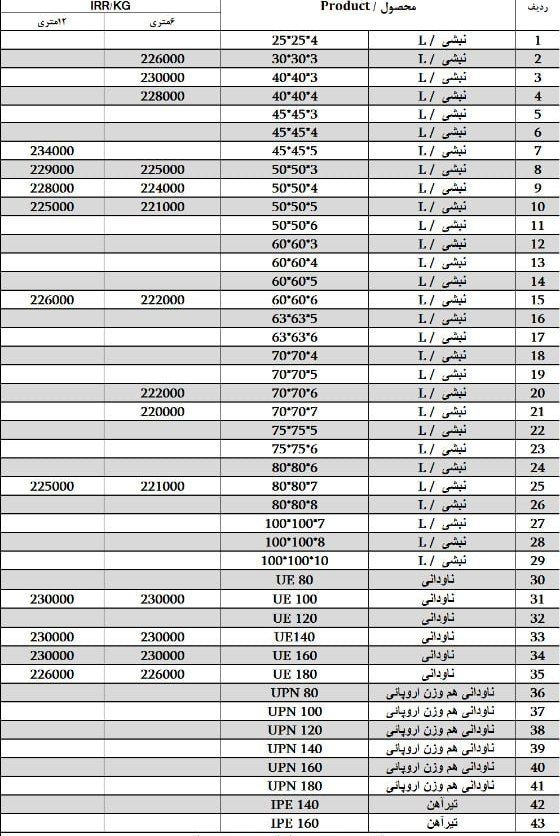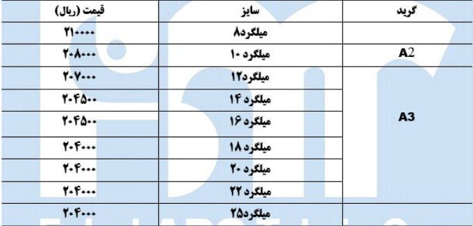 فولاد نورد کرمان میلگرد آجدار A3 سایز12: 204000میلگرد آجدار A3 سایز14: 202000میلگرد آجدار A3 سایز16: 202000میلگرد آجدار A3 سایز18: 201000میلگرد آجدار A3 سایز20: ...