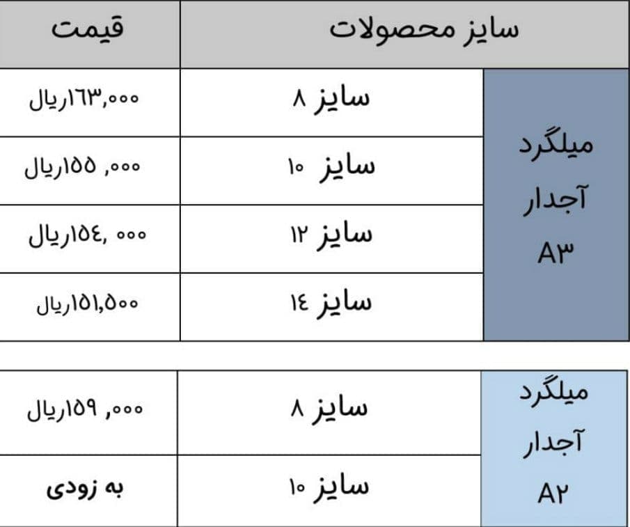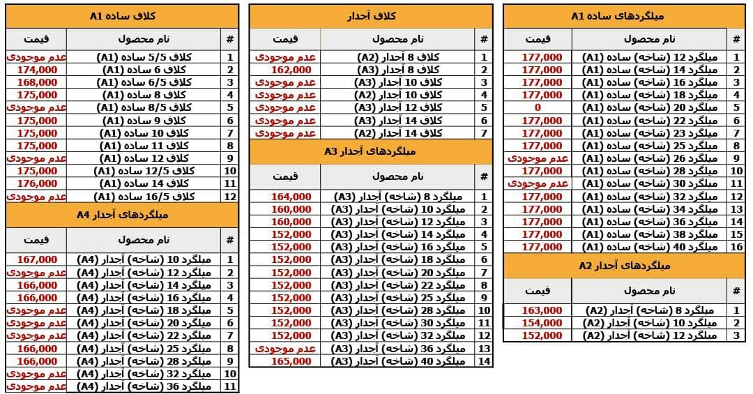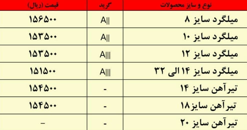 میلگرد: ۱۰(A3) 153000 ۱۲(A3) 153000 ۱۰(A2) 151500 ۱۲(A2) ۱۴_۲۵ 150500