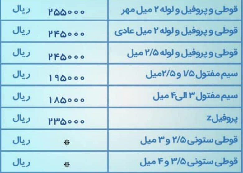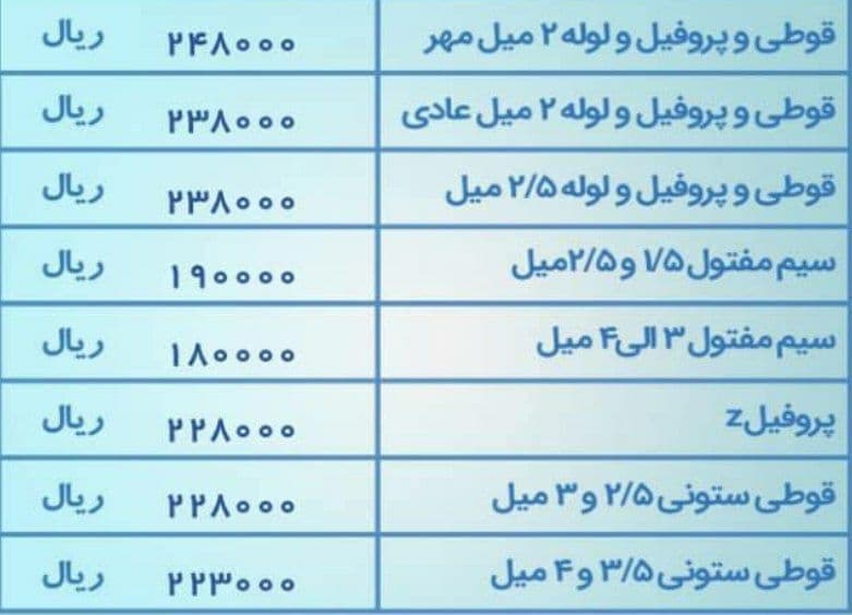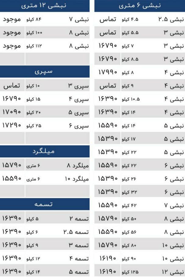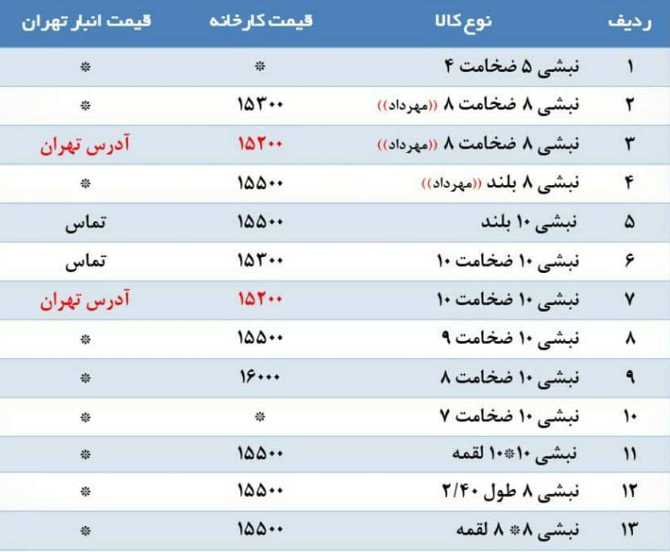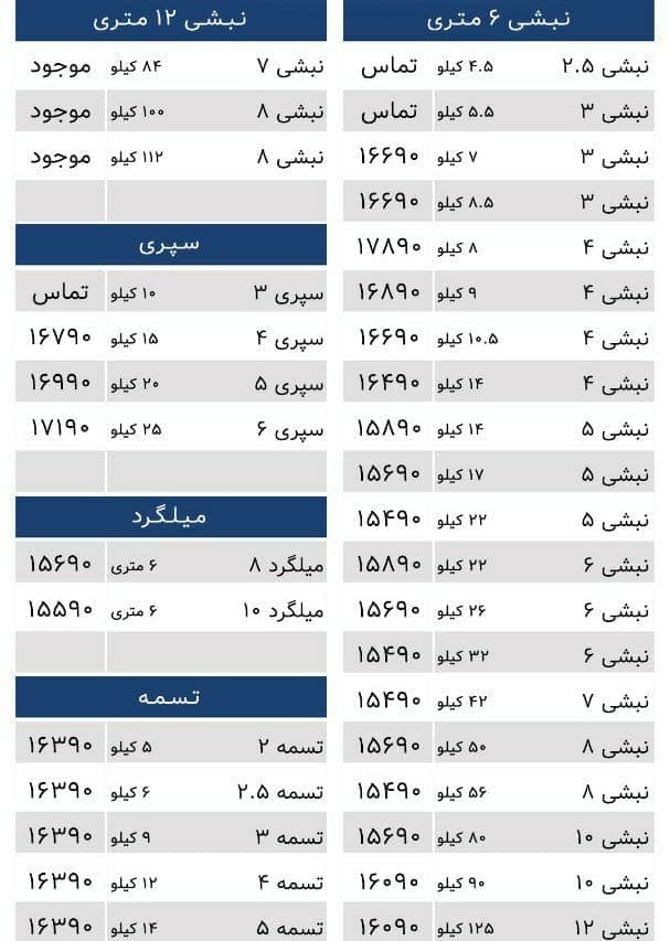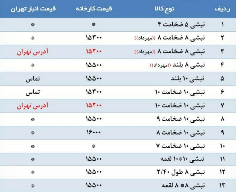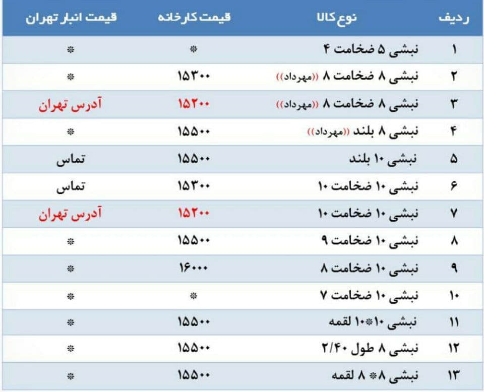 🔸نبشی: ۴/۲.۵ ۴/۳ 167000 ۴/۴ 156500 ۵/۴ 156500 ۵/۵ 156500 ۶/۶ 15650 ...