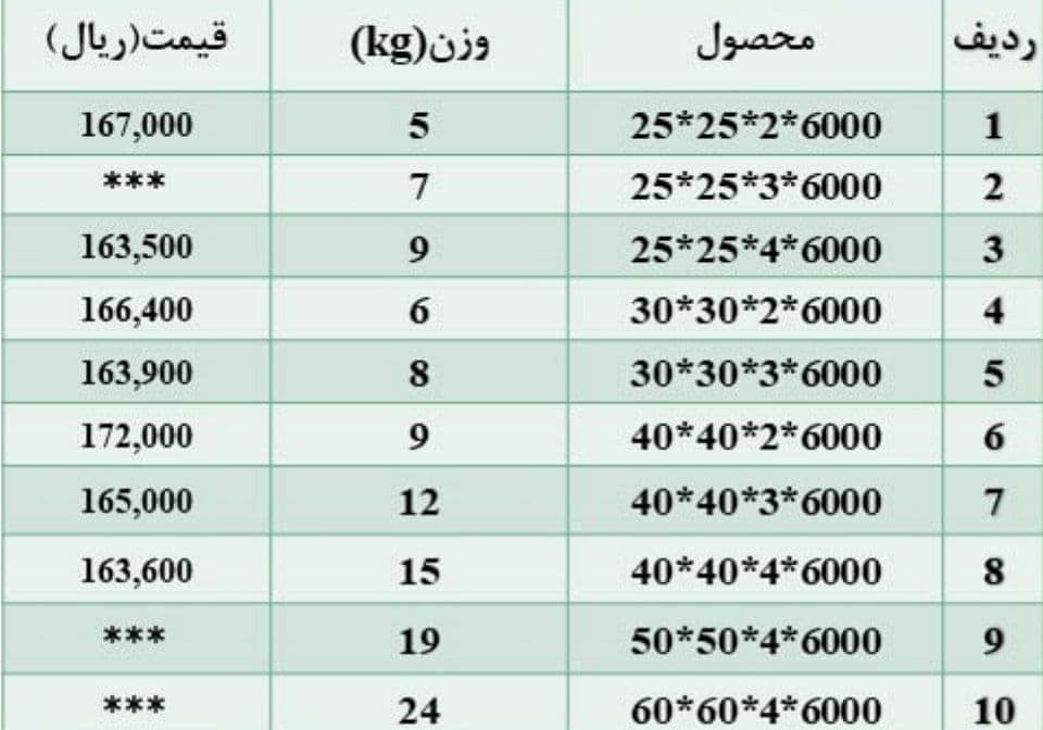 نبشی: ۴/۲.۵ ۴/۳ 167000 ۴/۴ ۵/۴ 156500 ۵/۵ 156500 ۶/۶ 156500 ۷/۷ ...