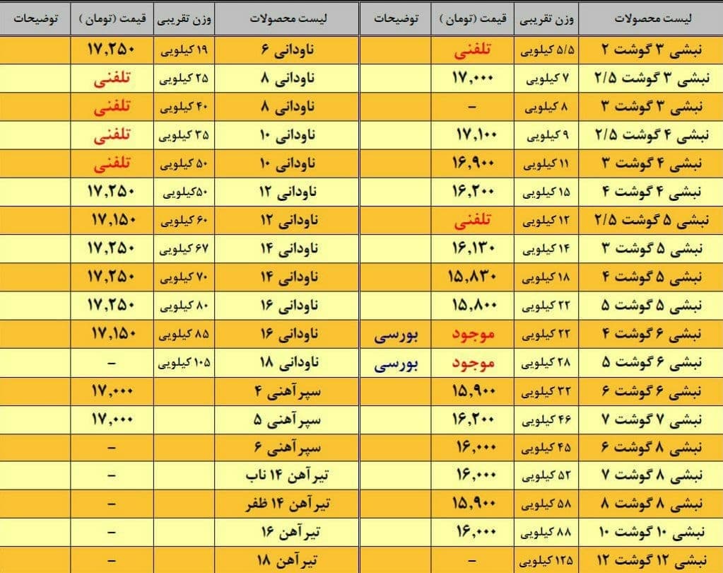 فولاد ماهان تیرآهن ۱۴ درجه یک قیمت 1/980/000 تومان تیر ۱۴ درجه ۱/۵ قیمت تومان 1/960/000 تیرآهن ۱۶ درجه یک قیمت 2/640/000 تومان تیرآهن ۱۶ درجه ۱/۵ ق ...