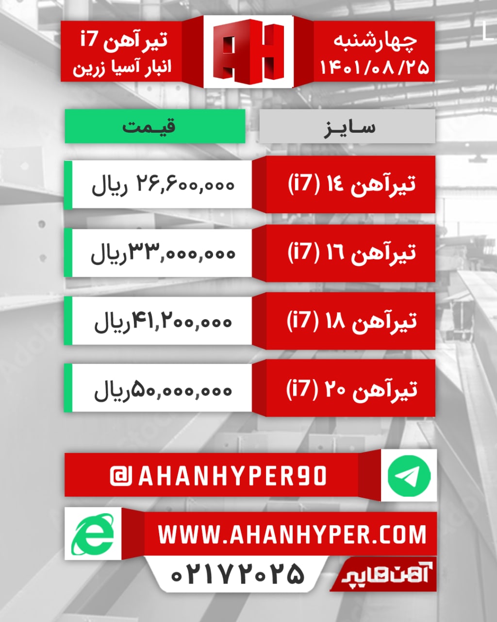 تیرآهن #متفرقه انبار #اصفهان (شاخهای) تیر۱۴ اطلس: ۲۳.۵۰۰.۰۰۰ ریال تیر۱۴ اهوازی: ۲۵.۵۰۰.۰۰۰ ریال تیر۱۶ کرمانشاه: ۳۱.۰۰۰.۰۰۰ ریال تیر۲۴ یزدی: ۷۰.۰۰۰.۰۰۰ ریال با ...