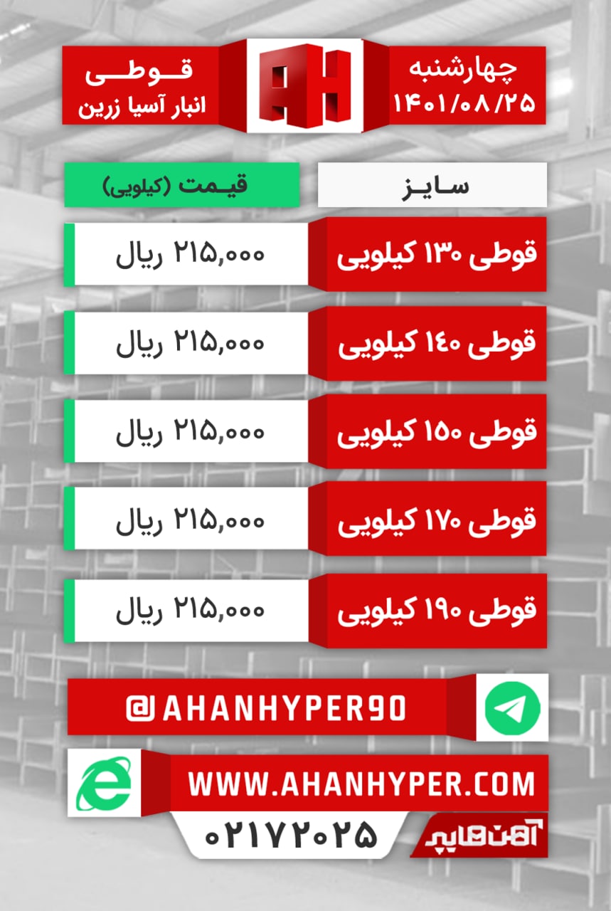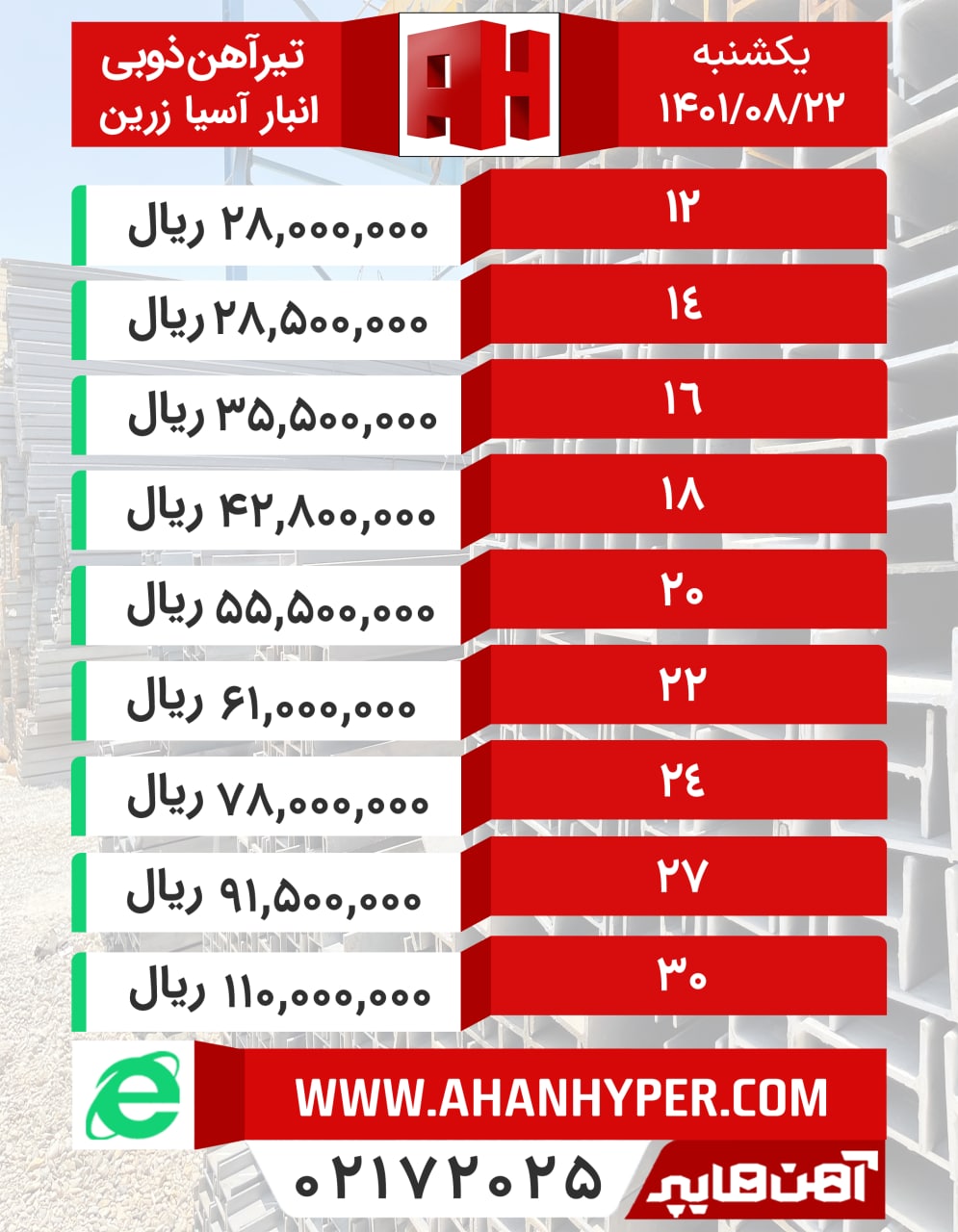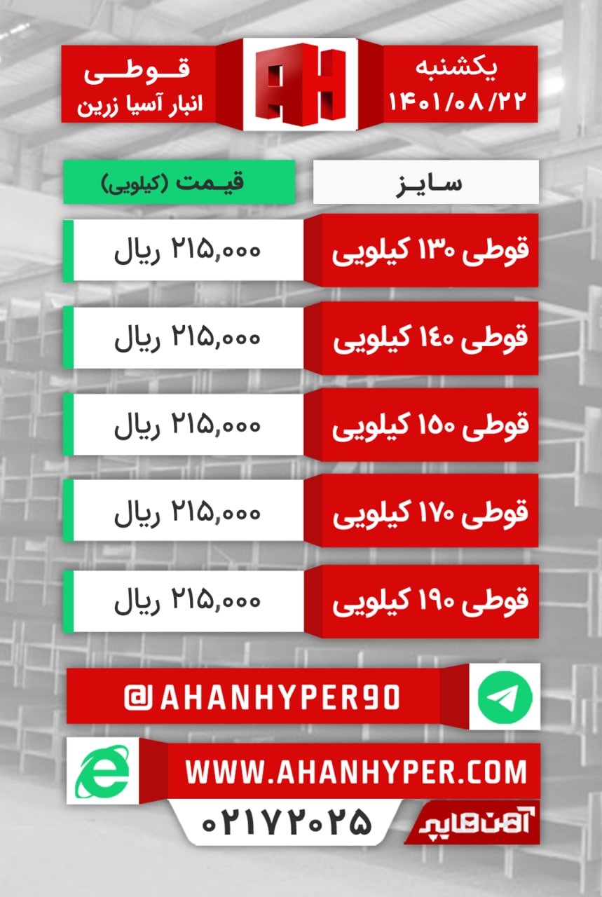 📆یکشنبه ۲۲ آبانماه ۱۴۰۱ #قیمت_تیرآهن #ذوب_آهن_اصفهان #شاخه_ای #بنگاه_اصفهان #انبار_آسیا_زرین ✅قیمت ها با تایید میباشد.