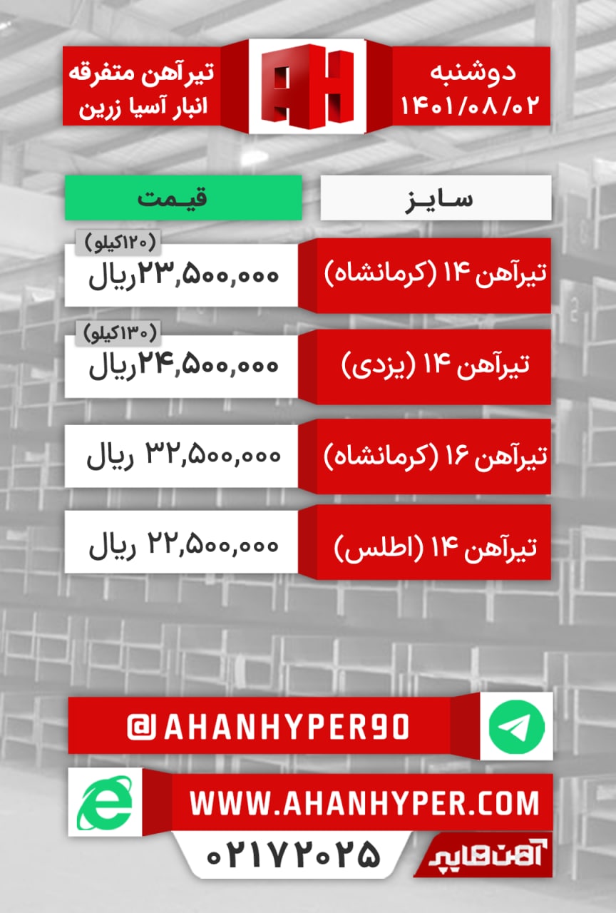 شنبه ۷ آبانماه ۱۴۰۱ #قیمت_تیرآهن ذوب آهن (انبار آسیا زرین) ✅قیمت ها با تایید میباشد.