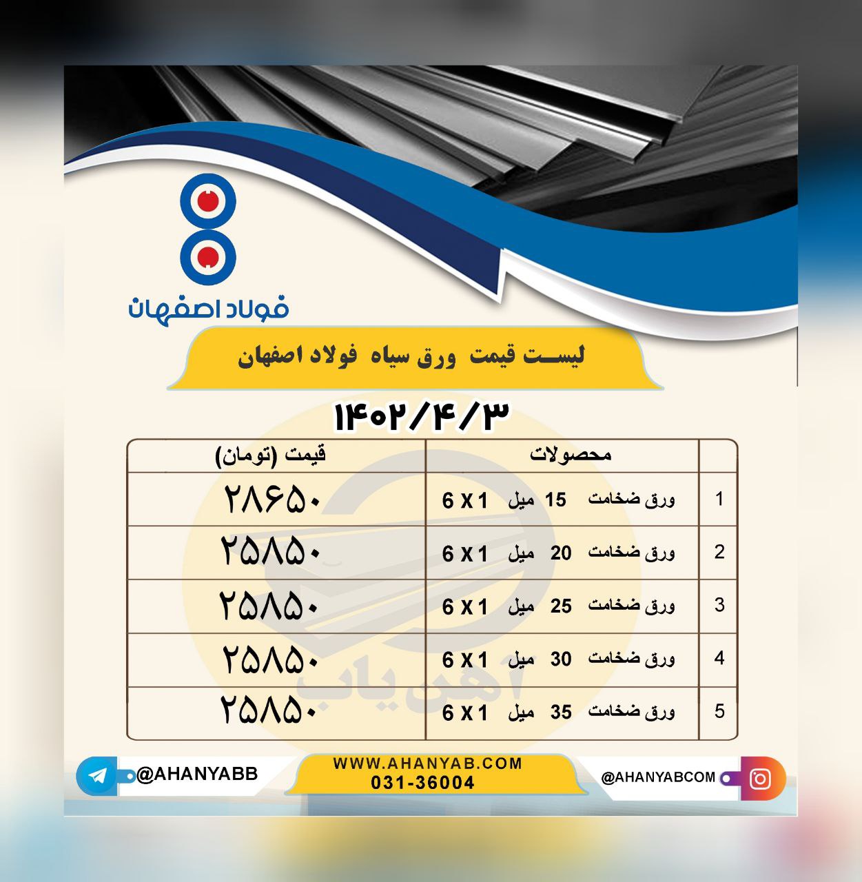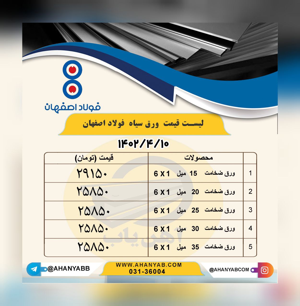 اعلام موجودی نبشی آهن یاب ❇️ لیست کالای فولاد ناب تبریز :📅 شنبه : ۱۴۰۲/۴/۳ (ثبات قیمت) ♦️ نبشی ۴*۴ 💵26150 تومان ♦️ نبشی ۷*۷ 💵26150 تومان ♦️ نبشی۵*۵ 💵26150 ...