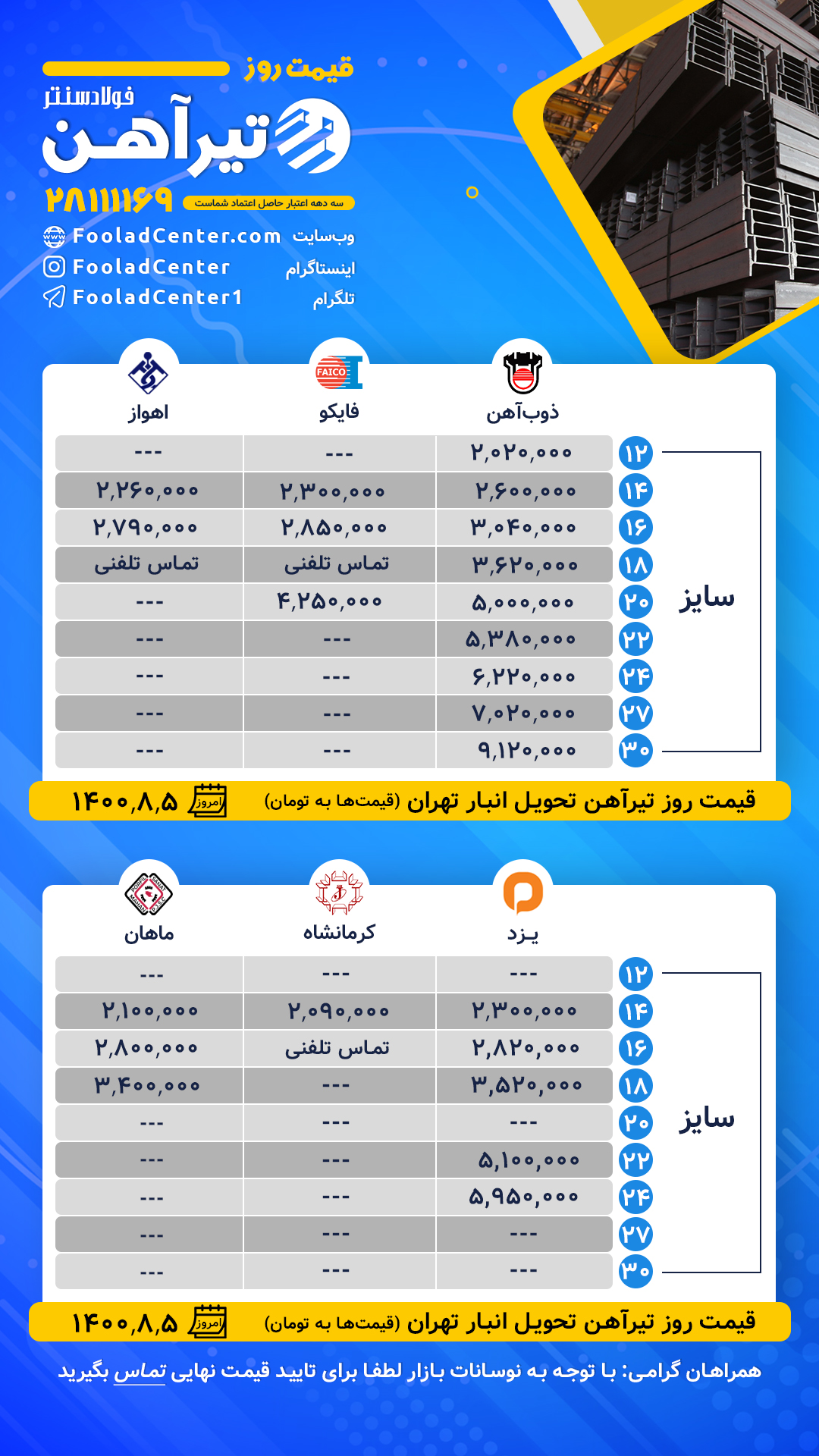 تیرآهن یزدی( فاکتور رسمی) انبار تهران تیرآهن 14 یزدی 133کیلو 22,700,000﷼ تیرآهن 16 یزدی 170کیلو 27,900,000﷼ تیرآهن 18 یزدی 210کیلو ...