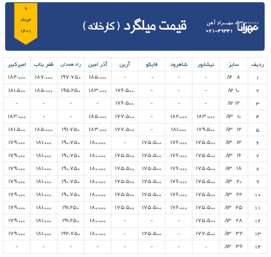 شرکت سام گستر دقیق (مهراد آهن) 📆 دوشنبه ۱۴۰۱/۰۳/۰۹ ⬅️ قیمت میلگرد (کارخانه) 📞 ۰۲۱-۴۹۳۴۱ https://t.me/mehradahan https://instagram.com/mehradah ...