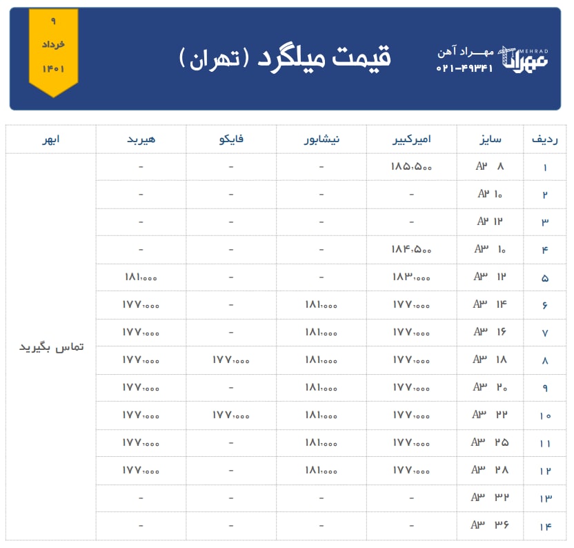 شرکت سام گستر دقیق (مهراد آهن) 📆 دوشنبه ۱۴۰۱/۰۳/۰۹ ⬅️ قیمت میلگرد (تهران) 📞 ۰۲۱-۴۹۳۴۱ https://t.me/mehradahan https://instagram.com/mehradahan ...