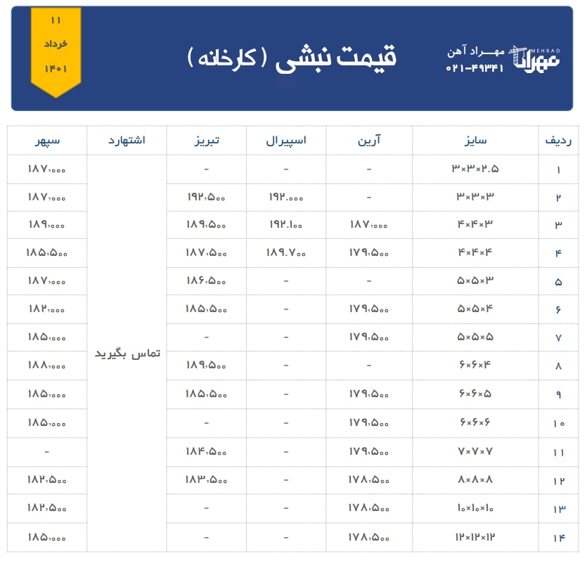 شرکت سام گستر دقیق (مهراد آهن) 📆 سه شنبه ۱۴۰۱/۰۳/۲۴ ⬅️ قیمت میلگرد (کارخانه) 📞 ۰۲۱-۴۹۳۴۱ https://t.me/mehradahan https://instagram.com/mehrada ...
