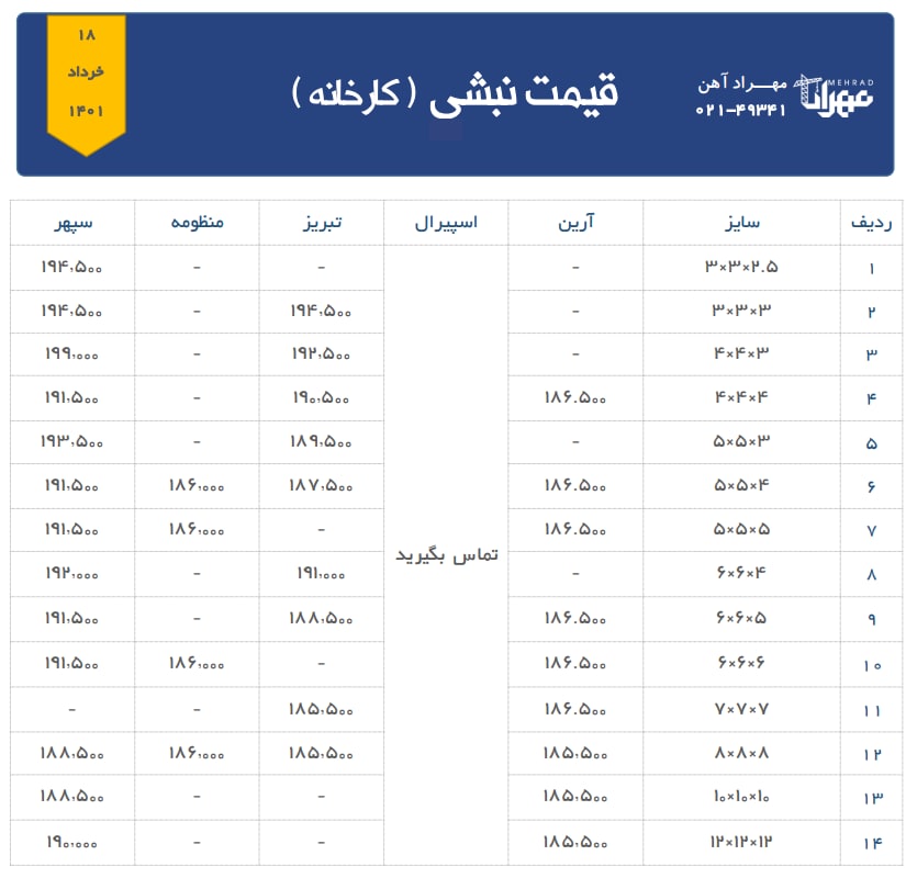 شرکت سام گستر دقیق (مهراد آهن) 📆 چهارشنبه ۱۴۰۱/۰۳/۱۸ ⬅️ قیمت میلگرد (تهران) 📞 ۰۲۱-۴۹۳۴۱ https://t.me/mehradahan https://instagram.com/mehradah ...
