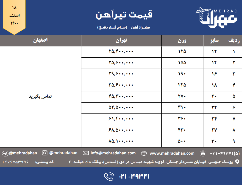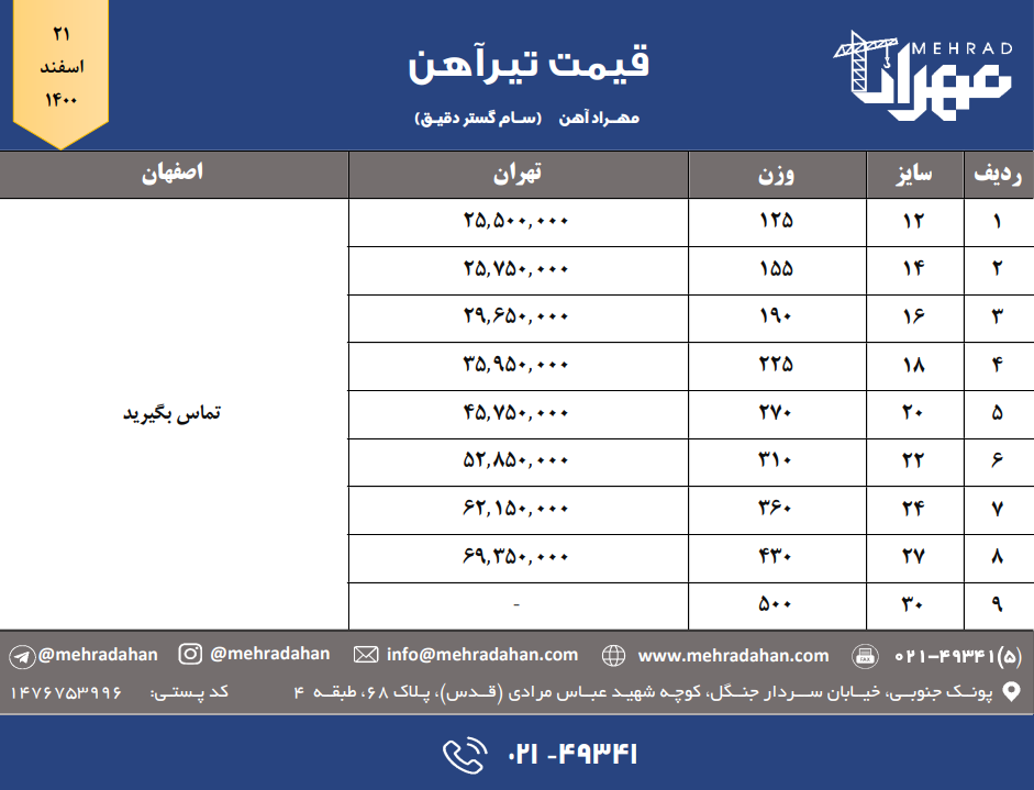 شرکت سام گستر دقیق (مهراد آهن) 📆 یکشنبه ۱۴۰۰/۱۲/۲۲ ⬅️ قیمت تیرآهن IPE 📞 ۰۲۱-۴۹۳۴۱ https://t.me/mehradahan 🌐 www.mehradahan.com
