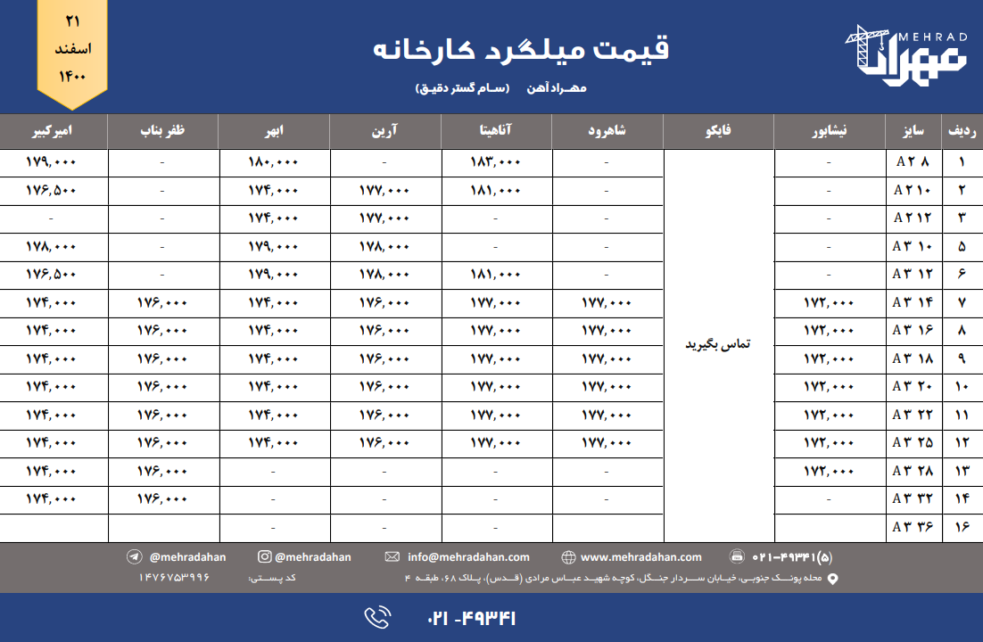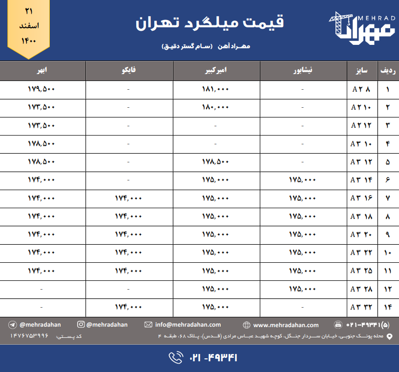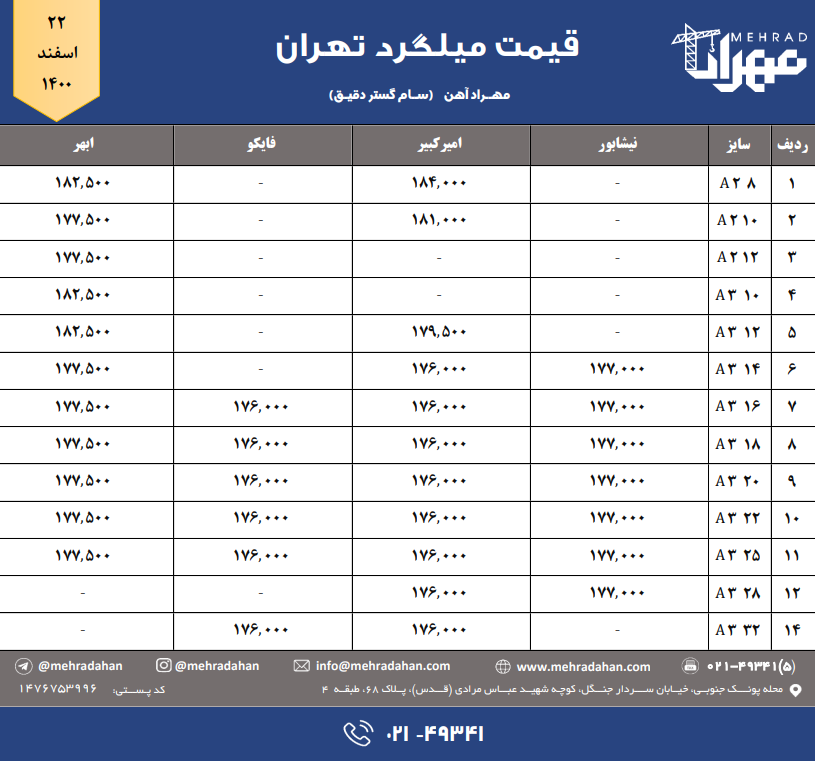 شرکت سام گستر دقیق (مهراد آهن) 📆 شنبه ۱۴۰۰/۱۲/۲۱ ⬅️ قیمت میلگرد (تهران) 📞 ۰۲۱-۴۹۳۴۱ https://t.me/mehradahan 🌐 www.mehradahan.com