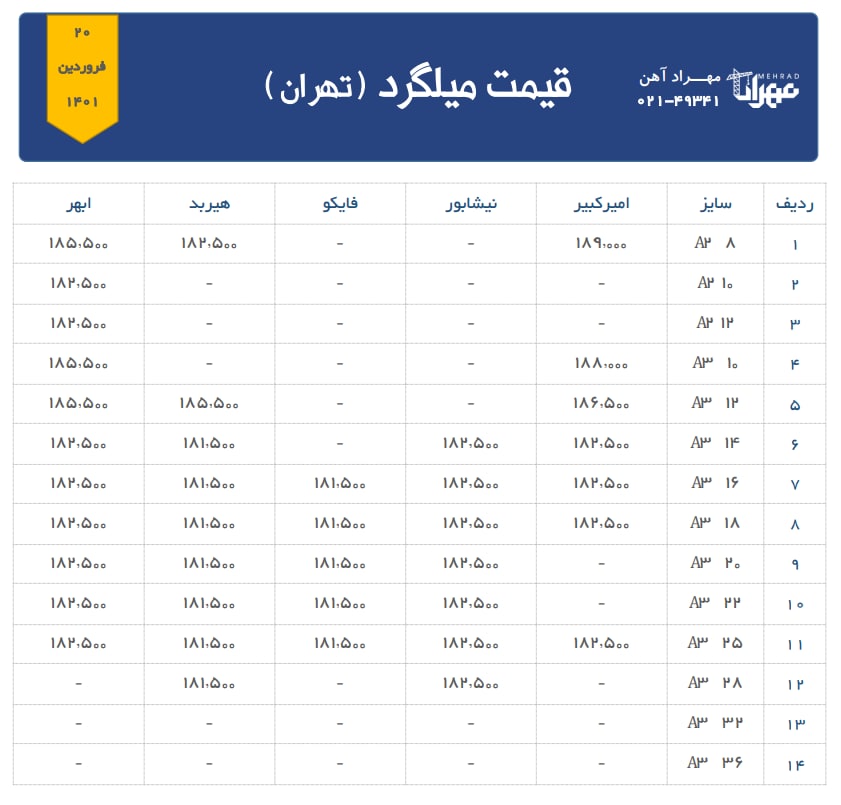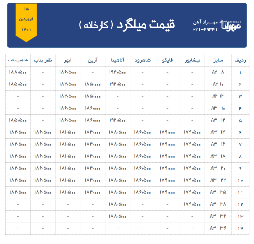 شرکت سام گستر دقیق (مهراد آهن) 📆 چهارشنبه ۱۴۰۱/۰۱/۱۷ ⬅️ قیمت میلگرد (تهران) 📞 ۰۲۱-۴۹۳۴۱ https://t.me/mehradahan 🌐 www.mehradahan.com
