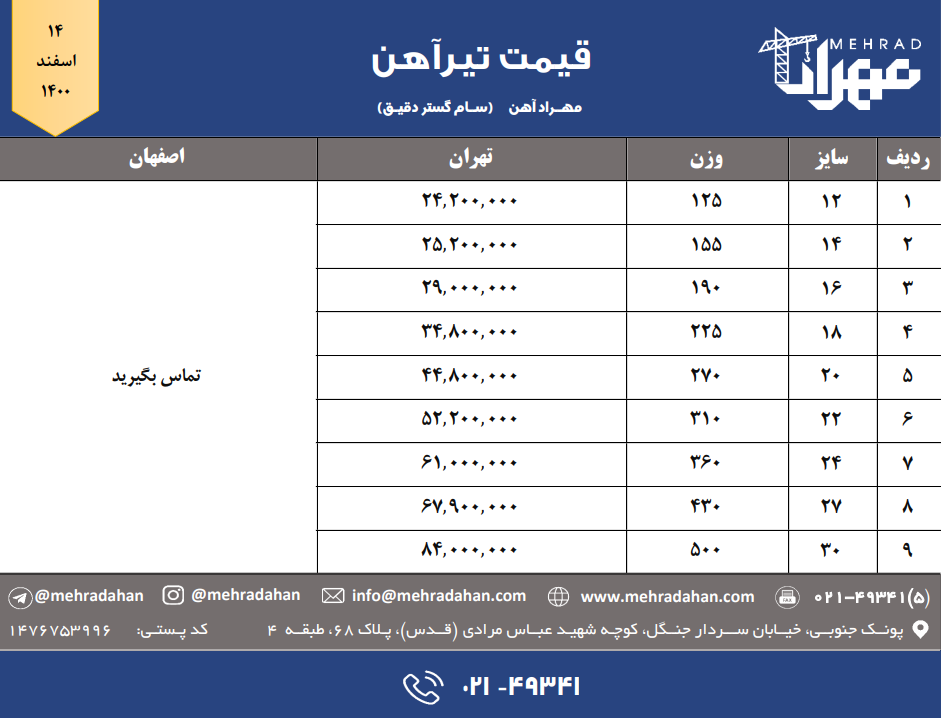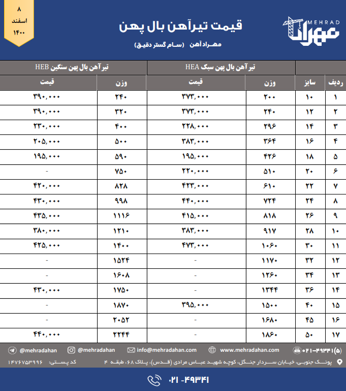 شرکت سام گستر دقیق (مهراد آهن) 📆 یکشنبه ۱۴۰۰/۱۲/۰۸ ⬅️ قیمت تیرآهن بال پهن سبک و سنگین 📞 ۰۲۱-۴۹۳۴۱ https://t.me/mehradahan 🌐 www.mehradahan.com