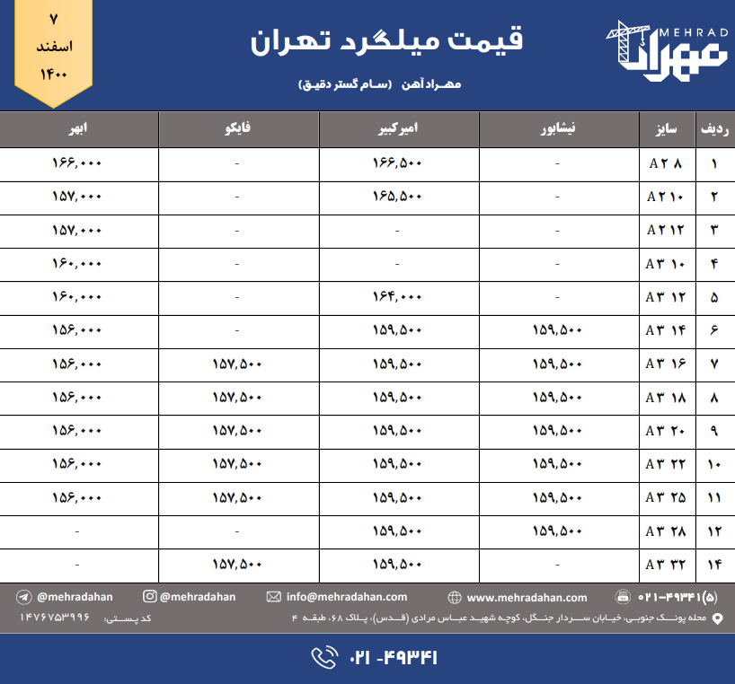 شرکت سام گستر دقیق (مهراد آهن) 📆 چهارشنبه ۱۴۰۰/۱۲/۱۱ ⬅️ قیمت میلگرد (تهران) 📞 ۰۲۱-۴۹۳۴۱ https://t.me/mehradahan 🌐 www.mehradahan.com