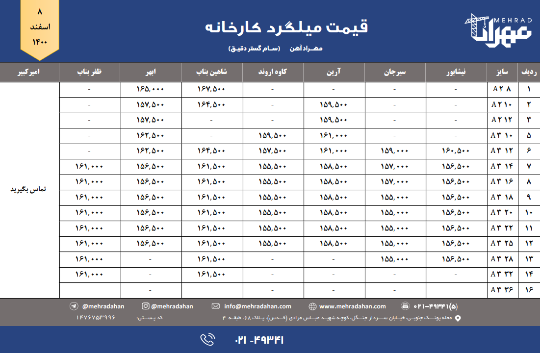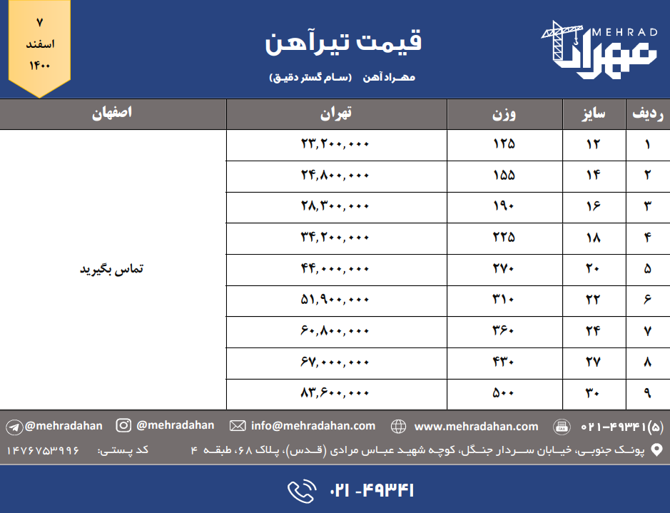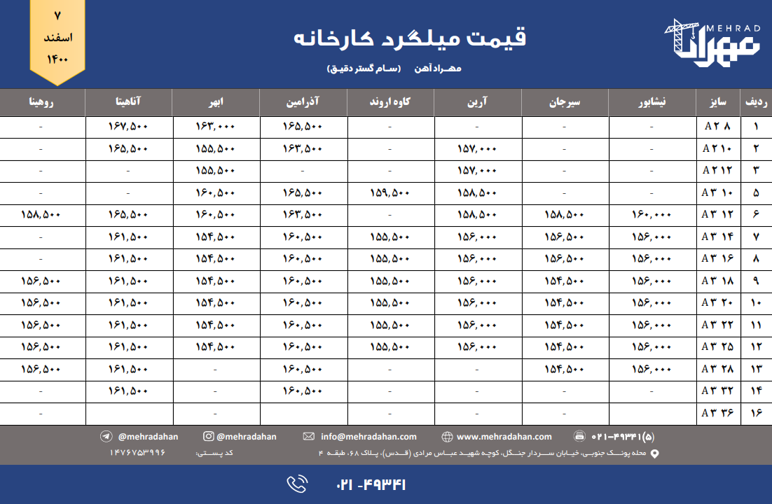 شرکت سام گستر دقیق (مهراد آهن) 📆 شنبه ۱۴۰۰/۱۲/۰۷ ⬅️ قیمت میلگرد (تهران) 📞 ۰۲۱-۴۹۳۴۱ https://t.me/mehradahan 🌐 www.mehradahan.com