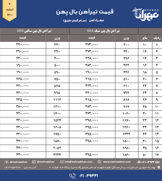 شرکت سام گستر دقیق (مهراد آهن) 📆 چهارشنبه ۱۴۰۰/۱۲/۱۱ ⬅️ قیمت تیرآهن بال پهن سبک و سنگین 📞 ۰۲۱-۴۹۳۴۱ https://t.me/mehradahan 🌐 www.mehradahan.com
