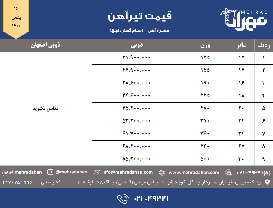 شرکت سام گستر دقیق (مهراد آهن) 📆 یکشنبه ۱۴۰۰/۱۱/۱۷ ⬅️ قیمت تیرآهن بال پهن سبک و سنگین 📞 ۰۲۱-۴۹۳۴۱ https://t.me/mehradahan 🌐 www.mehradahan.com