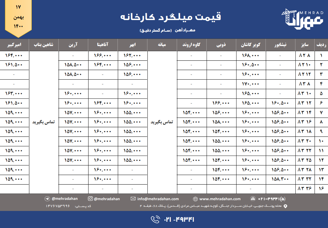 شرکت سام گستر دقیق (مهراد آهن) 📆 چهارشنبه ۱۴۰۰/۱۱/۲۰ ⬅️ قیمت میلگرد (تهران) 📞 ۰۲۱-۴۹۳۴۱ https://t.me/mehradahan 🌐 www.mehradahan.com