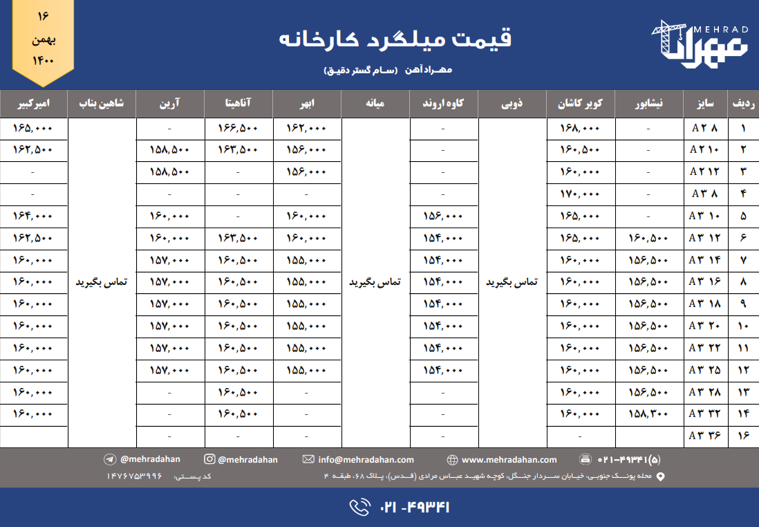 شرکت سام گستر دقیق (مهراد آهن) 📆 شنبه ۱۴۰۰/۱۱/۱۶ ⬅️ قیمت میلگرد (تهران) 📞 ۰۲۱-۴۹۳۴۱ https://t.me/mehradahan 🌐 www.mehradahan.com