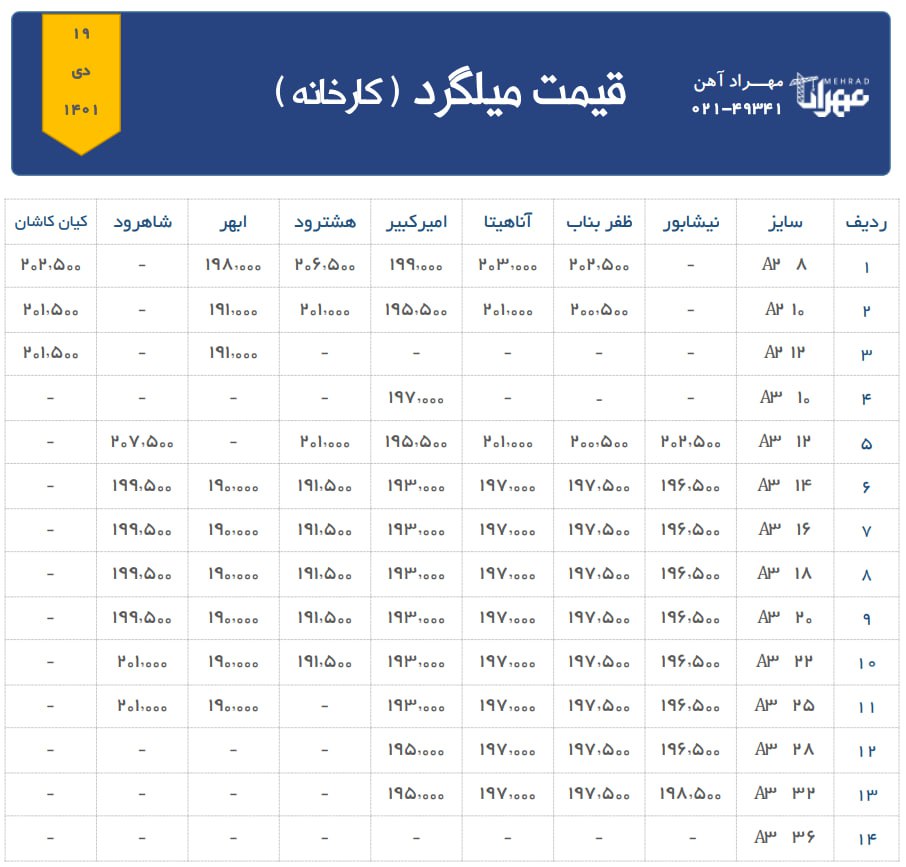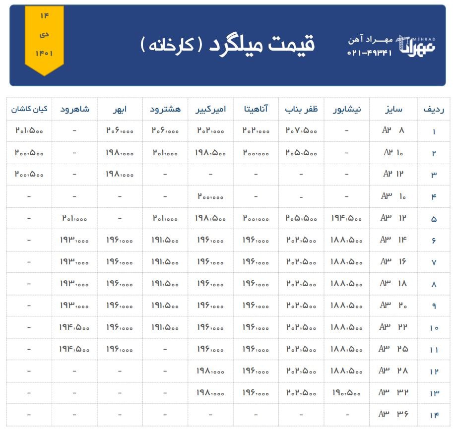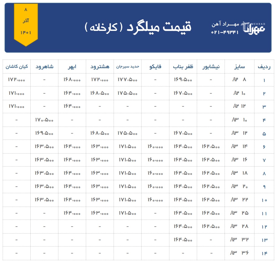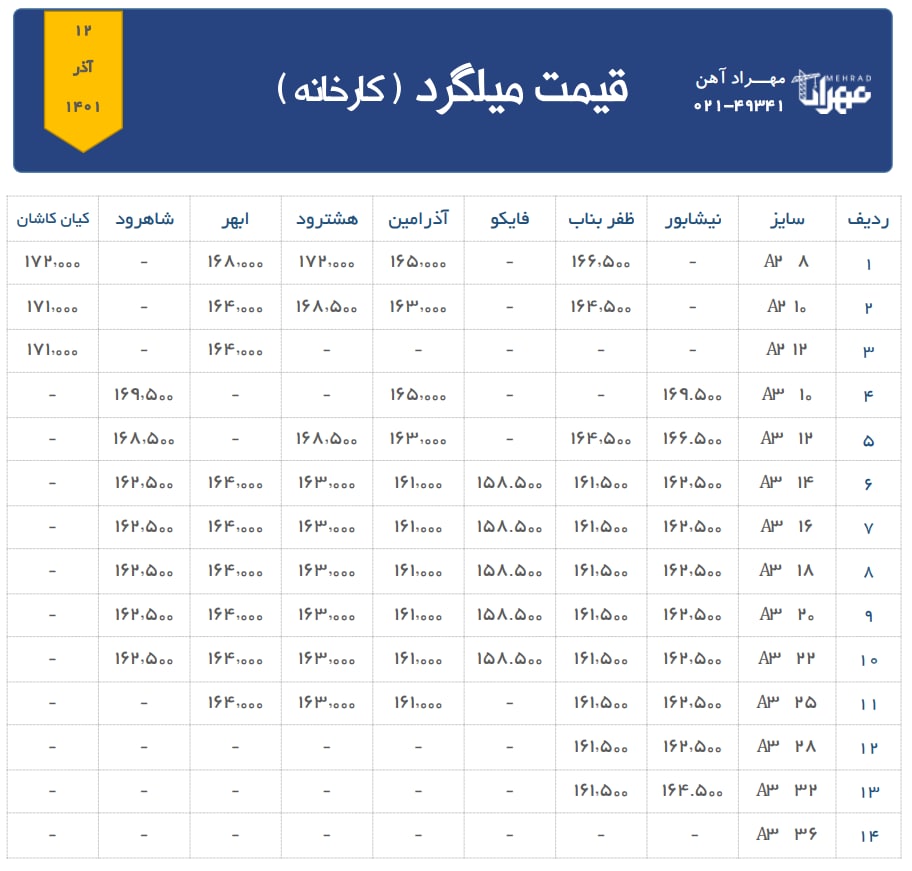شرکت سام گستر دقیق (مهراد آهن) 📆 چهارشنبه ۱۴۰۱/۰۹/۰۹ ⬅️ قیمت میلگرد (کارخانه) 📞 ۰۲۱-۴۹۳۴۱ https://t.me/mehradahan https://instagram.com/mehrad ...