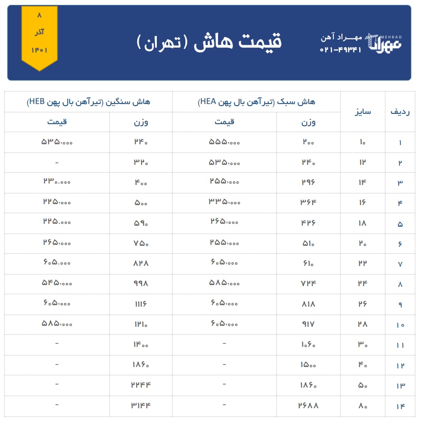 شرکت سام گستر دقیق (مهراد آهن) 📆 سه شنبه ۱۴۰۱/۰۹/۰۸ ⬅️ قیمت تیرآهن هاش (تهران) 📞 ۰۲۱-۴۹۳۴۱ https://t.me/mehradahan https://instagram.com/mehradahan 🌐 www.m ...