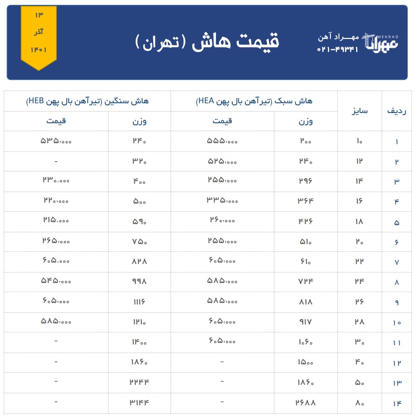 شرکت سام گستر دقیق (مهراد آهن) 📆 شنبه ۱۴۰۱/۰۹/۱۲ ⬅️ قیمت تیرآهن هاش (تهران) 📞 ۰۲۱-۴۹۳۴۱ https://t.me/mehradahan https://instagram.com/mehradahan 🌐 www.mehr ...