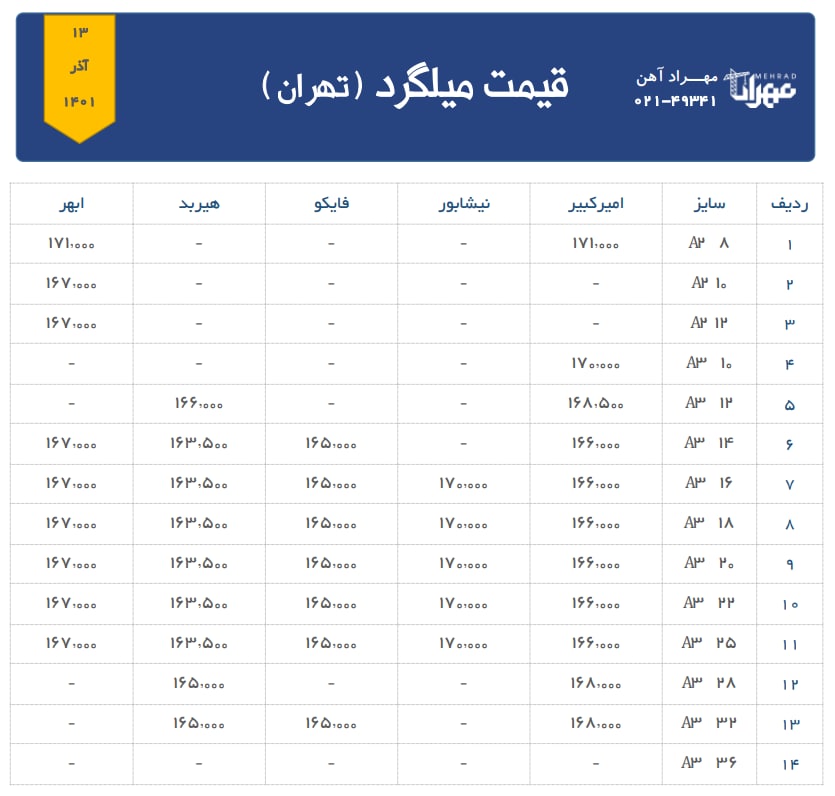 شرکت سام گستر دقیق (مهراد آهن) 📆 یکشنبه ۱۴۰۱/۰۹/۱۳ ⬇️ قیمت میلگرد A۳ ذوبی (کارخانه) ◽️میلگرد ۱۲ : - ◽️میلگرد ۱۴ : ۱۶۴.۰۰۰ ◽️میلگرد ۱۶ : ۱۶ ...