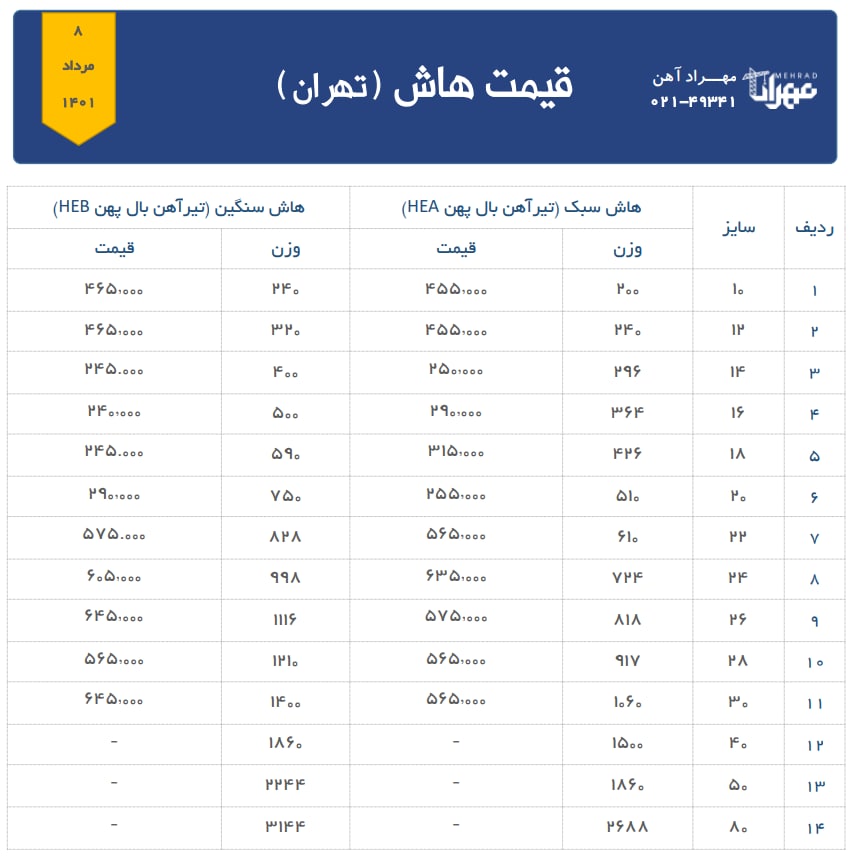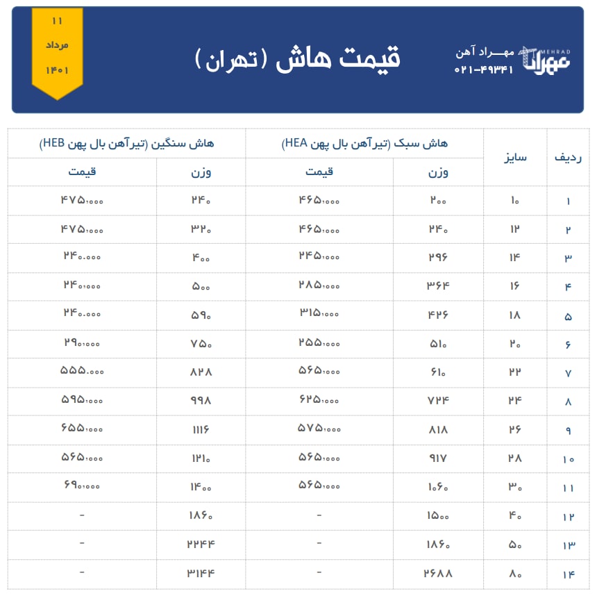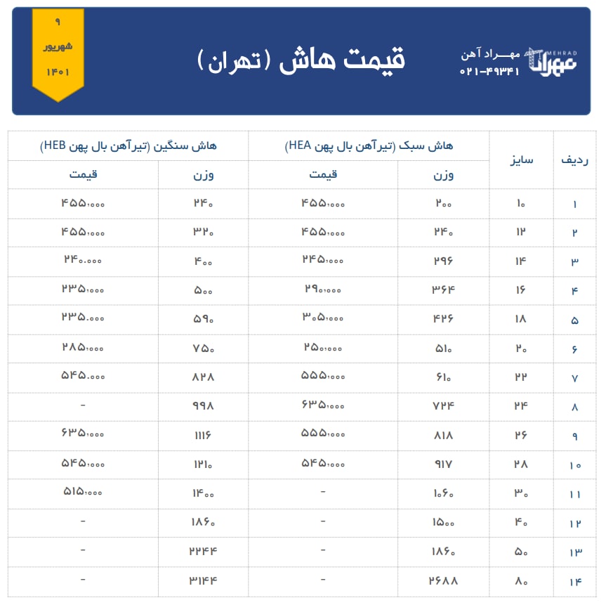 شرکت سام گستر دقیق (مهراد آهن) 📆 دوشنبه ۱۴۰۱/۰۵/۲۴ ⬅️ قیمت تیرآهن هاش (تهران) 📞 ۰۲۱-۴۹۳۴۱ https://t.me/mehradahan https://instagram.com/mehradahan 🌐 www.me ...