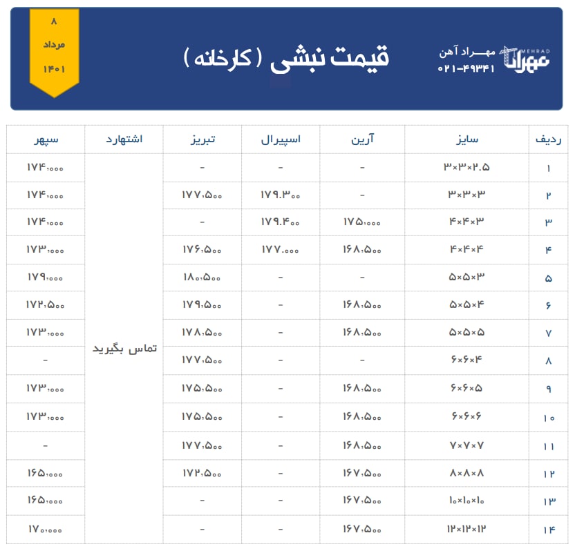 شرکت سام گستر دقیق (مهراد آهن) 📆 دوشنبه ۱۴۰۱/۰۵/۲۴ ⬅️ قیمت میلگرد (کارخانه) 📞 ۰۲۱-۴۹۳۴۱ https://t.me/mehradahan https://instagram.com/mehradah ...