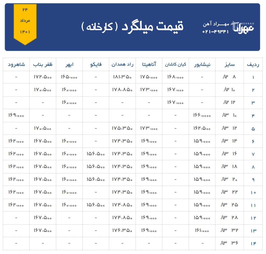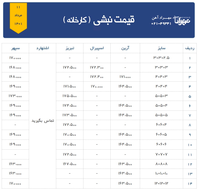 شرکت سام گستر دقیق (مهراد آهن) 📆 سه شنبه ۱۴۰۱/۰۵/۱۱ ⬅️ قیمت میلگرد (کارخانه) 📞 ۰۲۱-۴۹۳۴۱ https://t.me/mehradahan https://instagram.com/mehrada ...