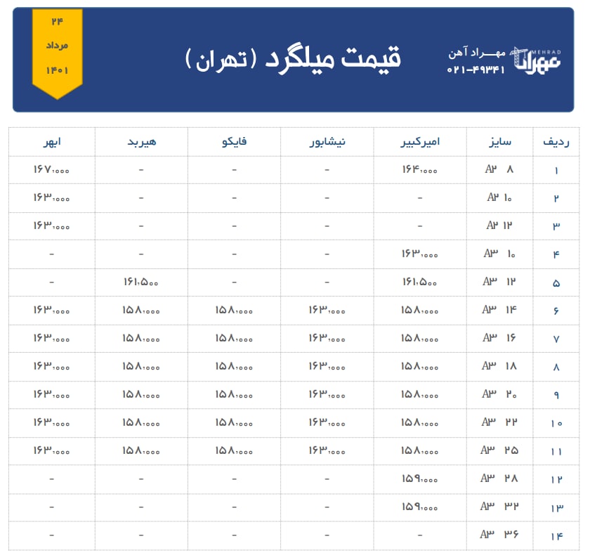 شرکت سام گستر دقیق (مهراد آهن) 📆 شنبه ۱۴۰۱/۰۵/۰۸ ⬅️ قیمت میلگرد (تهران) 📞 ۰۲۱-۴۹۳۴۱ https://t.me/mehradahan https://instagram.com/mehradahan 🌐 ...
