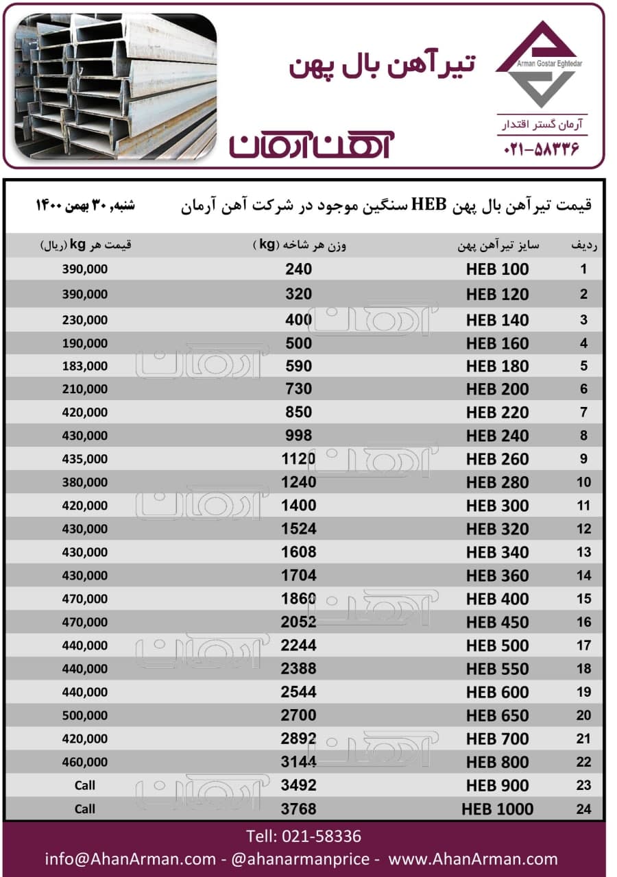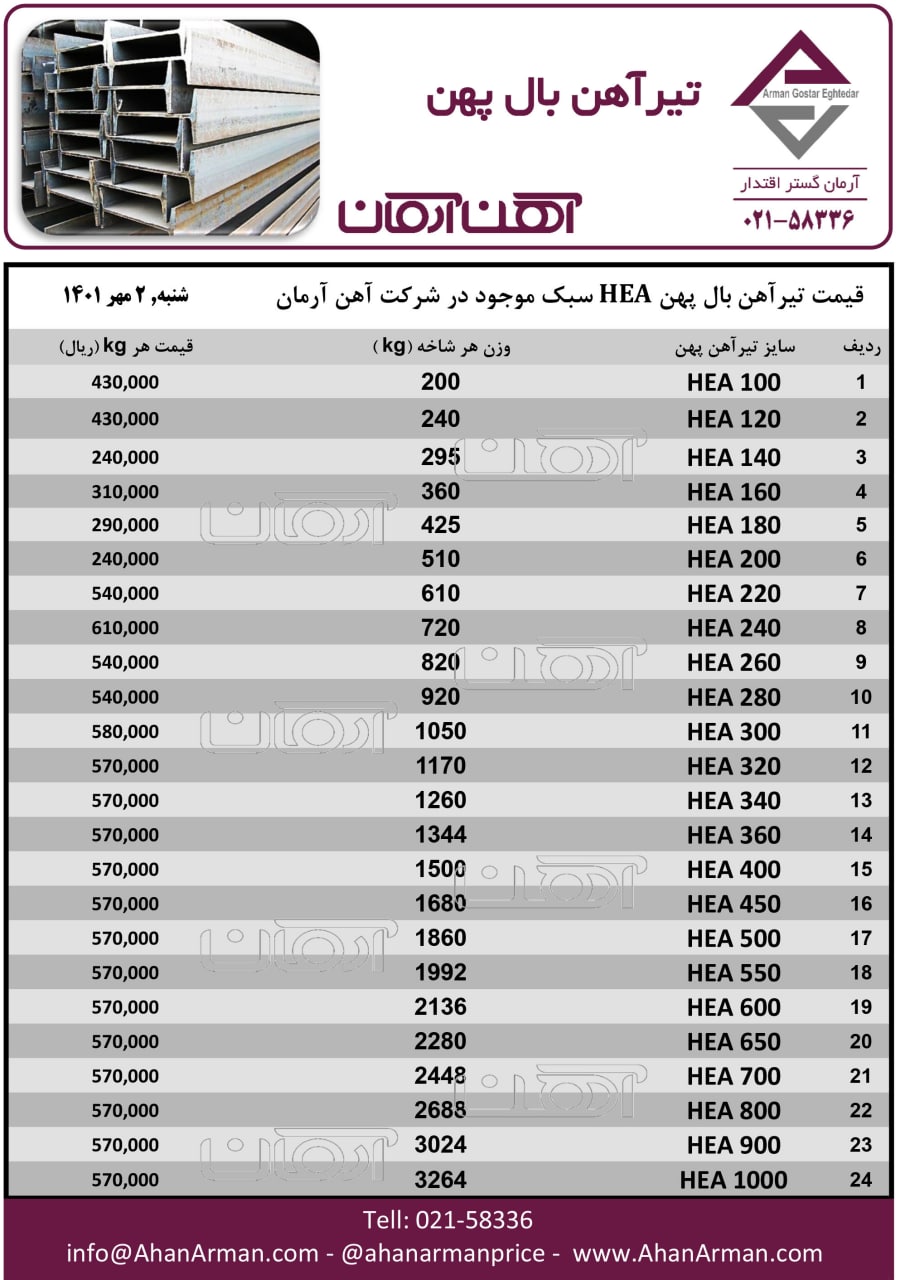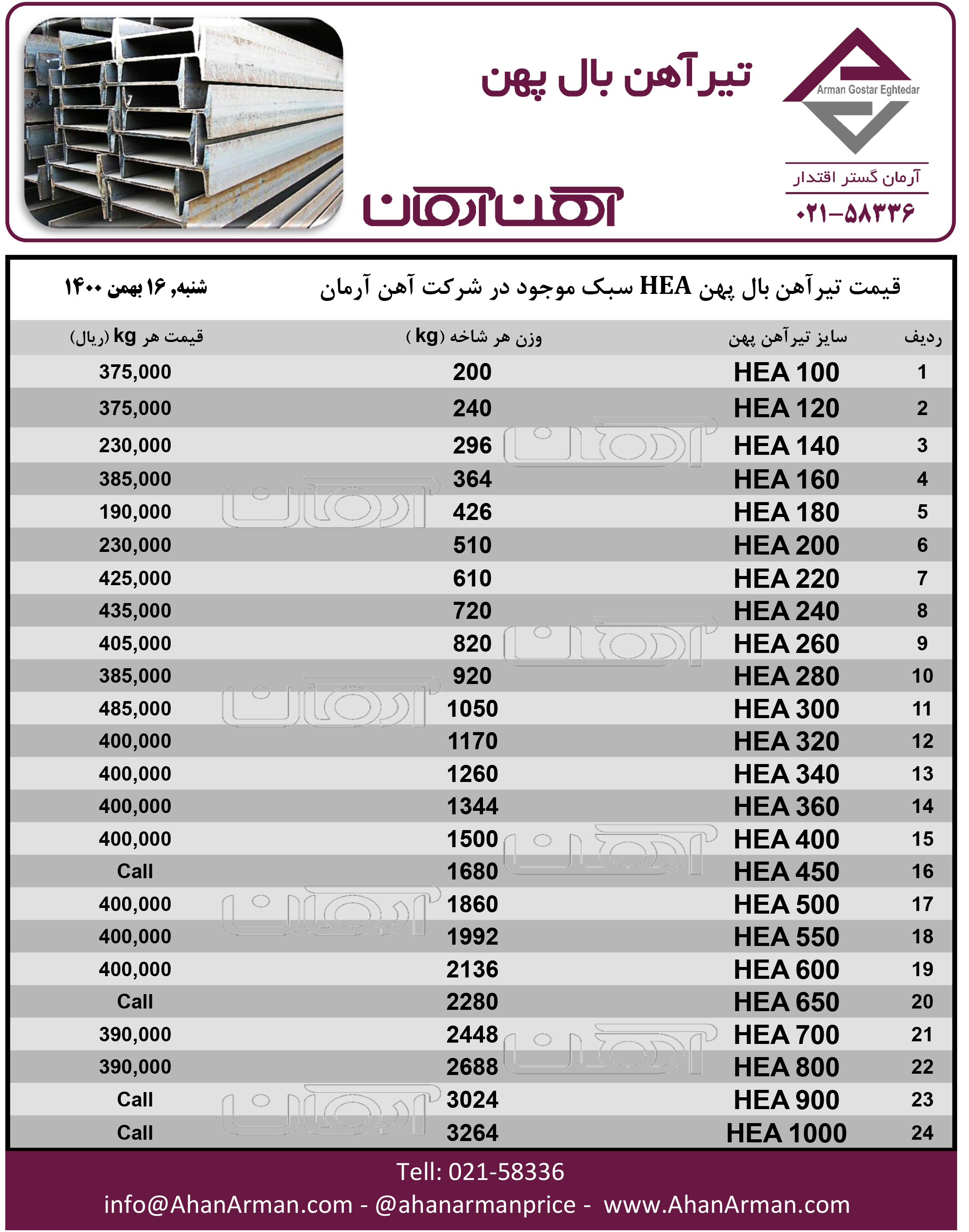 📢قیمت روز تیرآهن بال پهن سبک HEA انبار تهران📢 شاخه 12 متری (سایز 10 تا 100) ~~~~~~~~~~~~~~~~~ ☎️۰۲۱-۵۸۳۳۶ داخلی ۱۱۳ خانم طیبی 🌐www.ahanarman.com وب سایت @AhanA ...