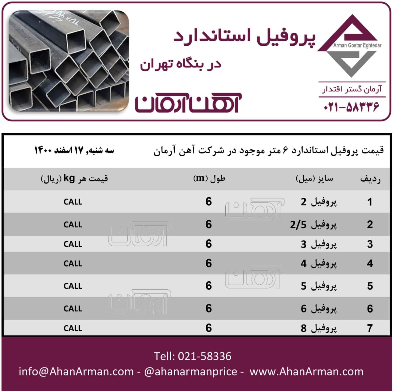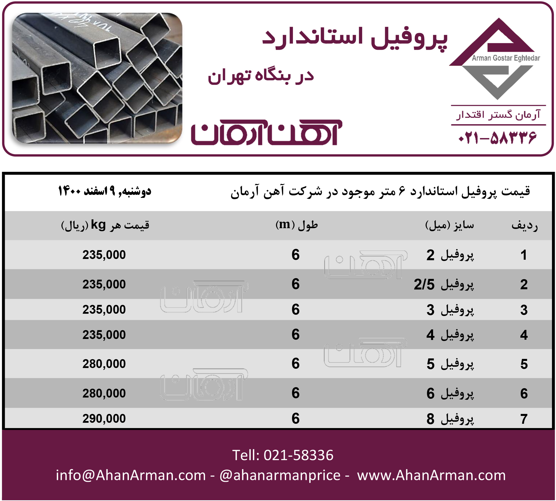 📢قیمت روز پروفیل استاندارد 6 متری📢 موجود در ضخامت های 2 الی 8 میل ~~~~~~~~~~~~~~~~~~ ☎️۰۲۱-۵۸۳۳۶ داخلی ۱۱۳ خانم طیبی 🌐www.ahanarman.com وب سایت @AhanArmanPric ...