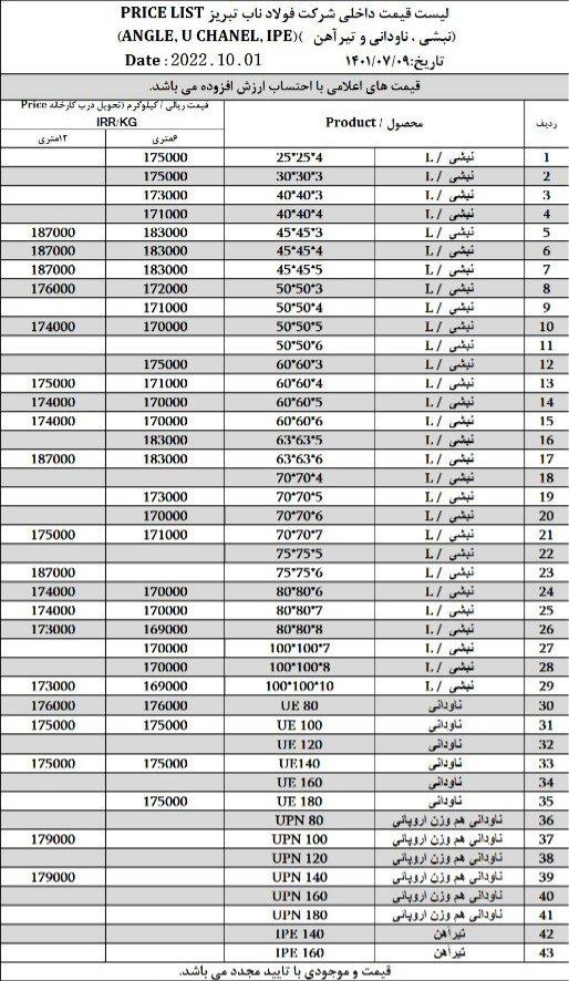 نبشی 4 ظهوریان⬅️17,500 نبشی 5 و 6 شکفته⬅️17,500 نبشی 6 و 5 ظهوریان ⬅️17,500 نبشی 5 ماهان ذوب⬅️17,300 نبشی 5,6 و 8 منظومه⬅️17,400 نبشی 8 و 10 آونگان اراک⬅️1 ...
