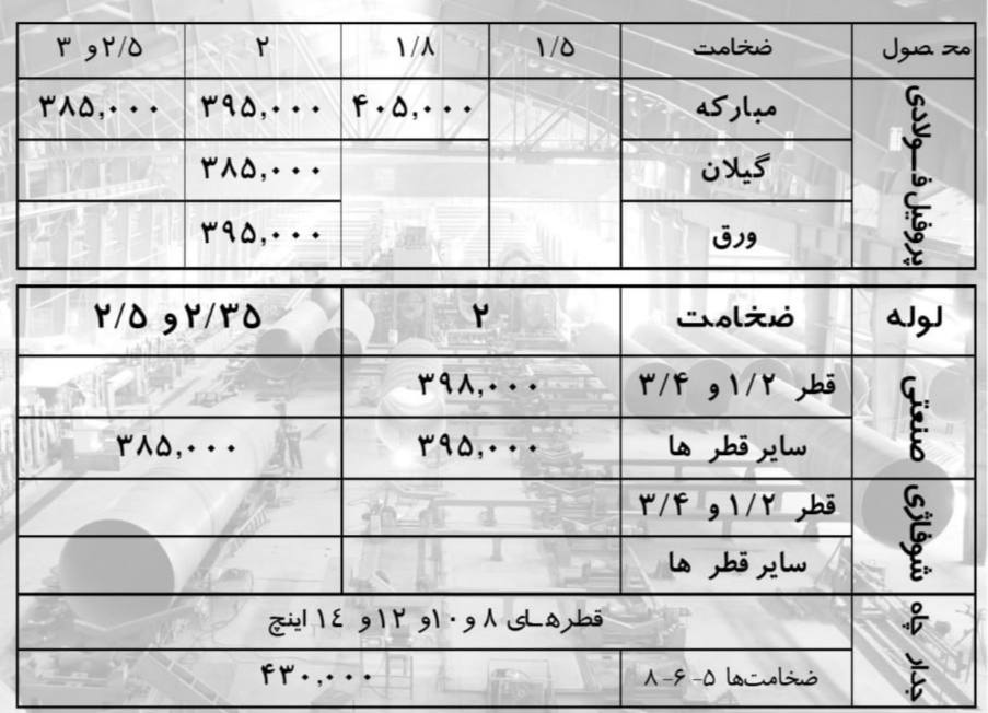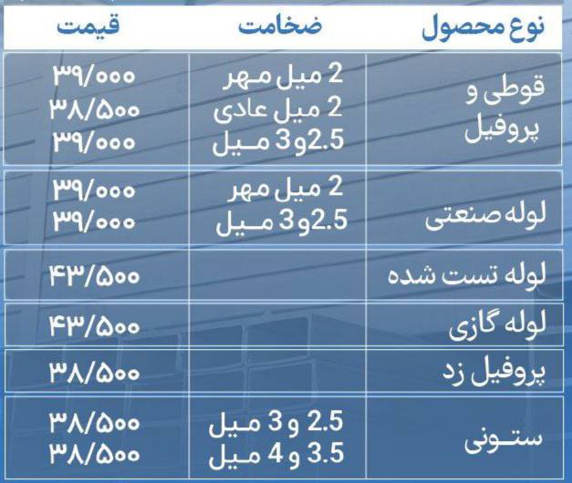 #فولاد_مهر_سهند لوله و پروفیل 🔸 مهر 2میل : ۳۷۸۰۰۰﷼ 🔸 عادی 2 میل : ۳۷۳۰۰۰﷼ 🔸پروفیل 2.5 میل مهر : ۳۷۸۰۰۰﷼ 🔸پروفیل 3 میل مهر : ۳۷۸۰۰۰﷼ 🔸ستونی : ۳۷۳۰۰۰﷼ 🔸زد سول ...