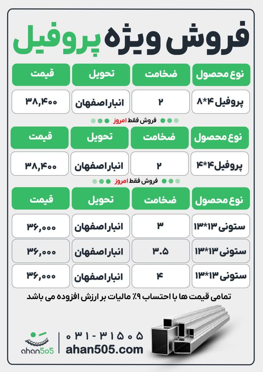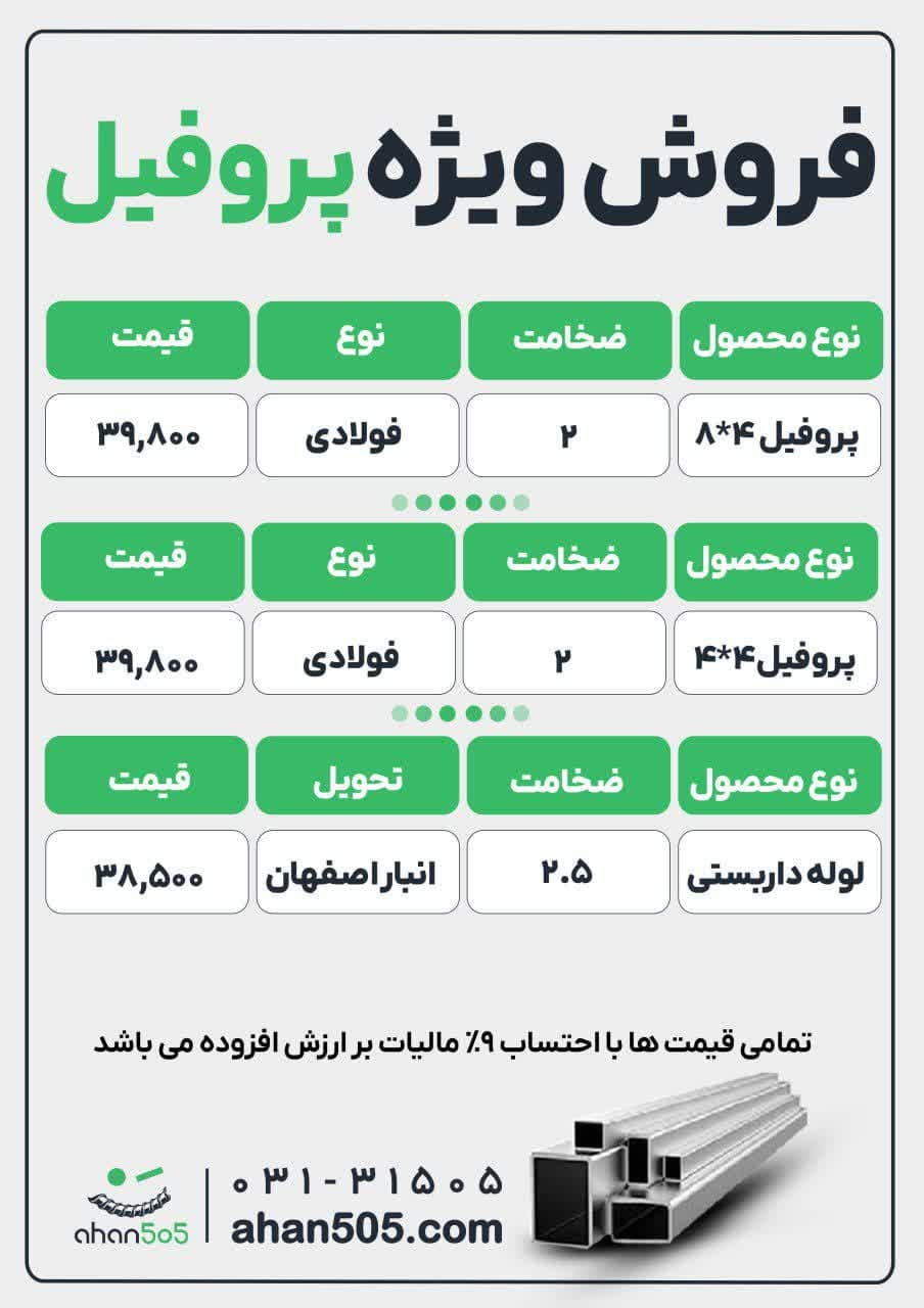 فروش ویژه پروفیل سایزهای مختلف ضخامت 2(فولاد -گیلان-اهواز) ضخامت 2.5-3-4(فولاد-گیلان- اهواز) ضخامت 5-6(فولاد) آقای بیگدلی 09133241453 031-31505 داخلی103-105