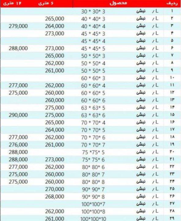 #آریان_فولاد نبشی 3*۴ »»»263000««« نبشی ۴*۴ »»»258000««« نبشی ۴*۵ »»»253000««« نبشی ۵*۵ »»»253000««« نبشی ۶*۶ »»» 253000««« نبشی ۷*۷ »»258000««« نبشی ۸*۸»»»253 ...
