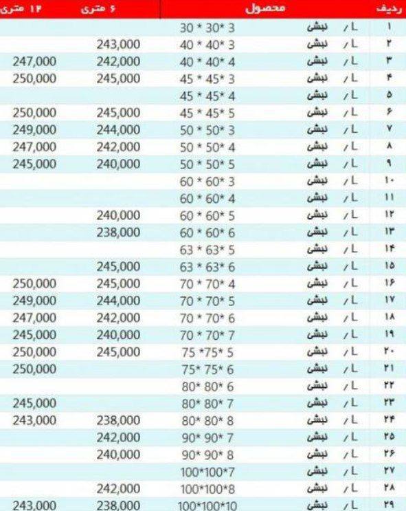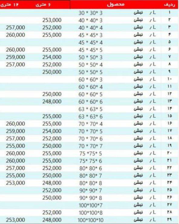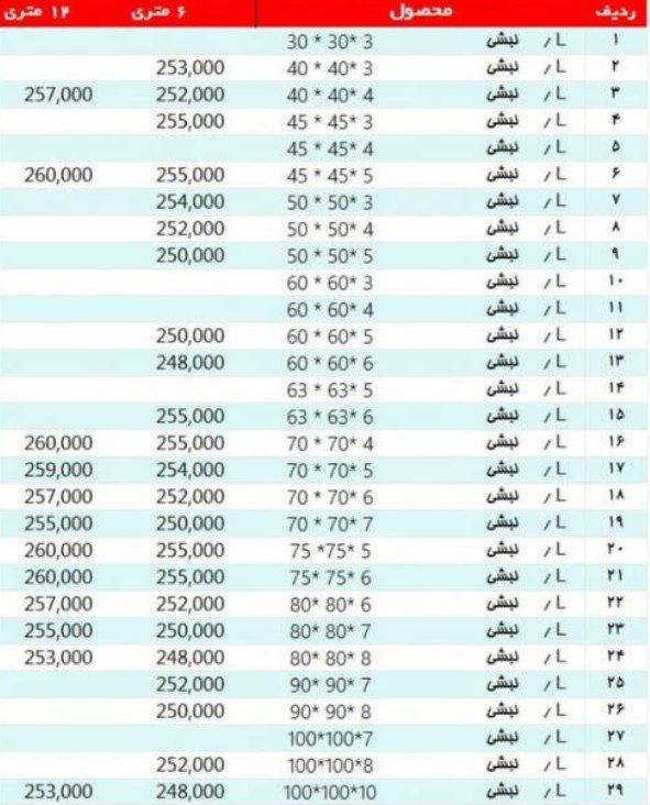 #آریان_فولاد نبشی 3*۴ »»248500««« نبشی ۴*۴ »»»243000««« نبشی ۴*۵ »»»239000««« نبشی ۵*۵ »»»239000««« نبشی ۶*۶ »»» 239000««« نبشی ۷*۷ »»»239000««« نبشی ۸*۸»»»239 ...