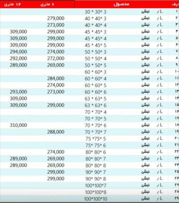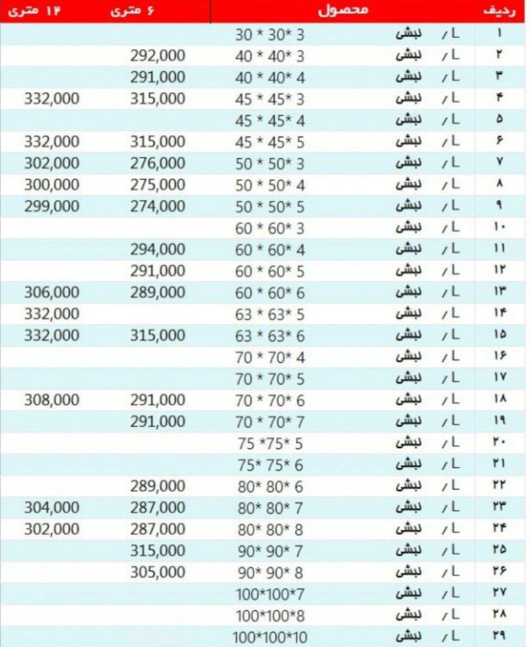 #آریان_فولاد نبشی 3*۴ »»»294000««« نبشی ۴*۴ »»»————««« نبشی ۴*۵ »»275000««« نبشی ۵*۵ »»»———««« نبشی ۶*۶ »»» 275000««« نبشی ۷*۷ »»288000««« نبشی ۸*۸»»»275000««« ...