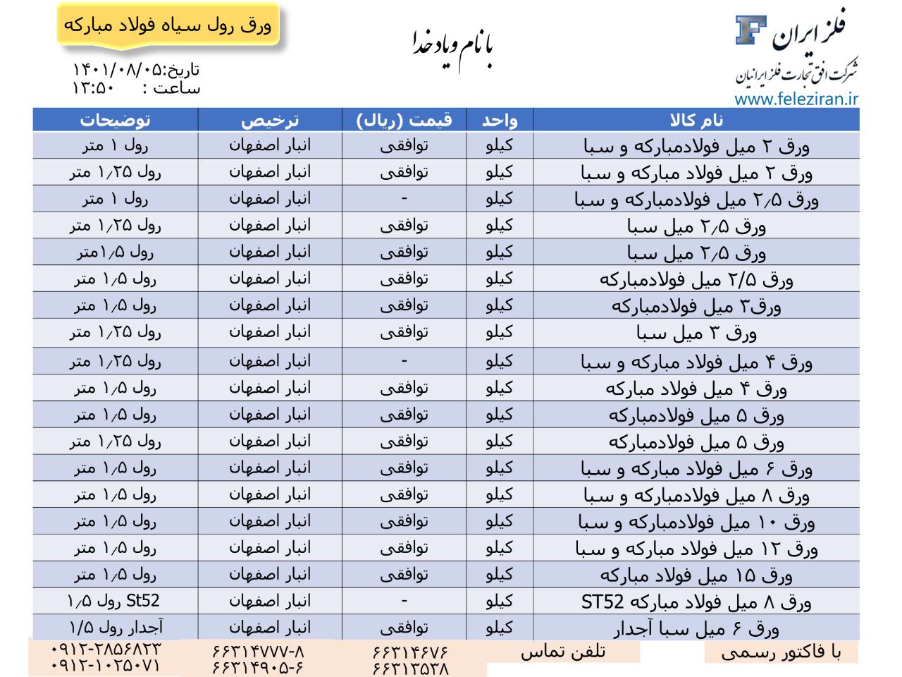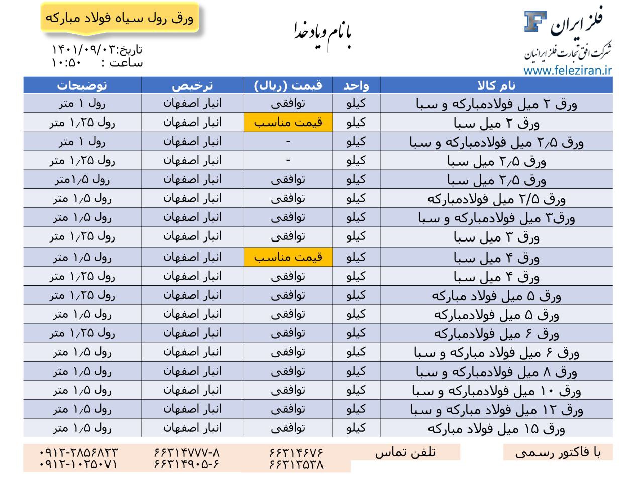 لیست موجودی و قیمت ورق رول سیاه مبارکه