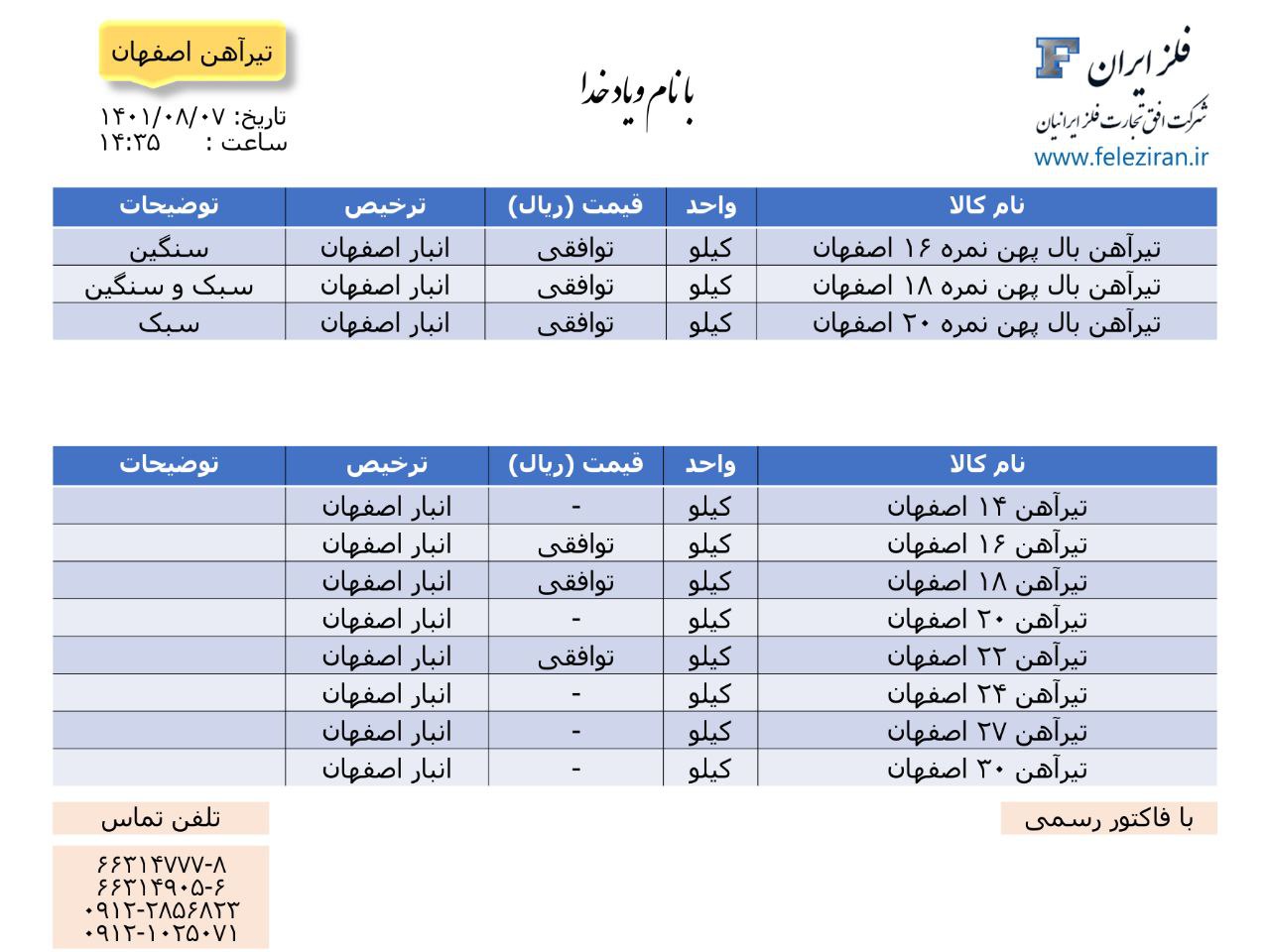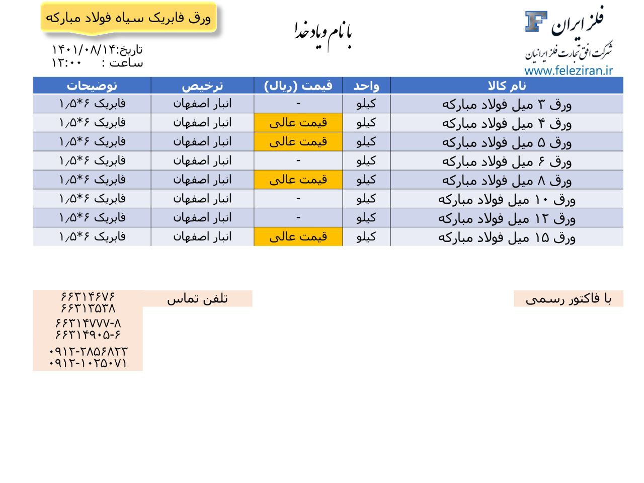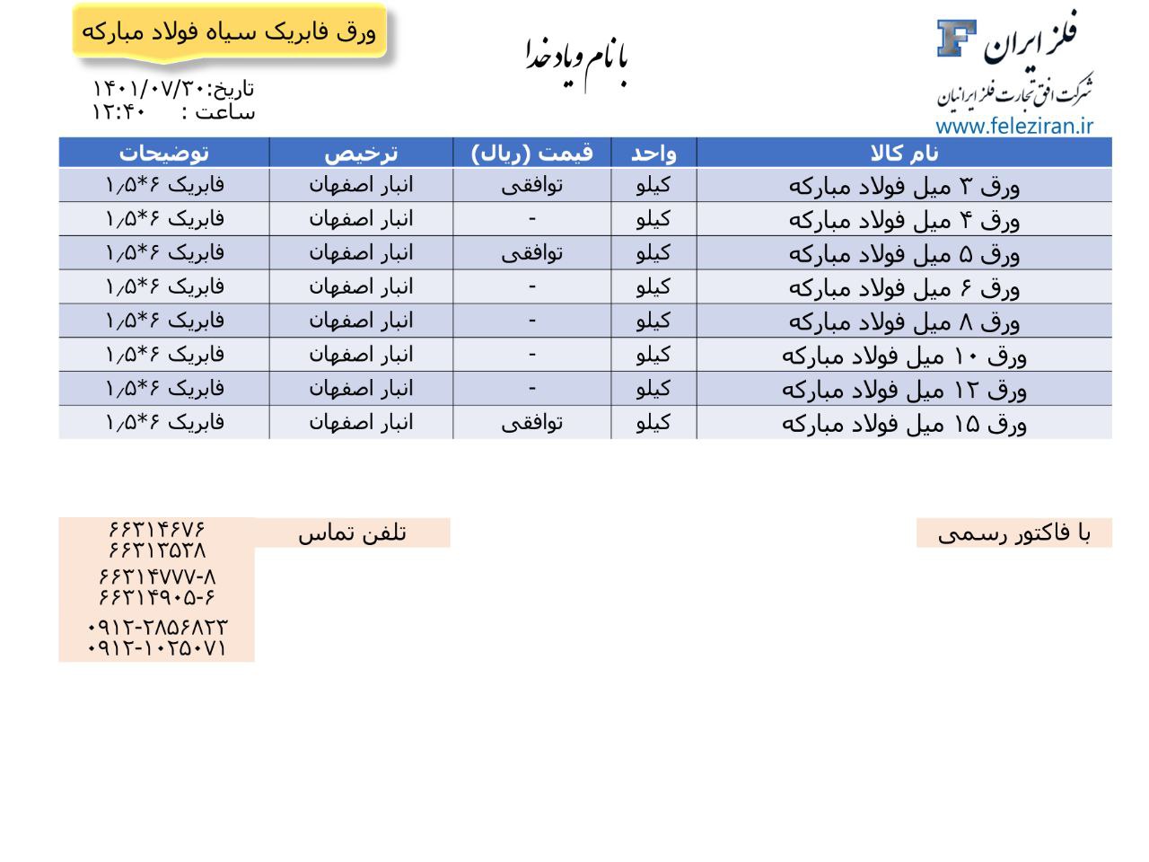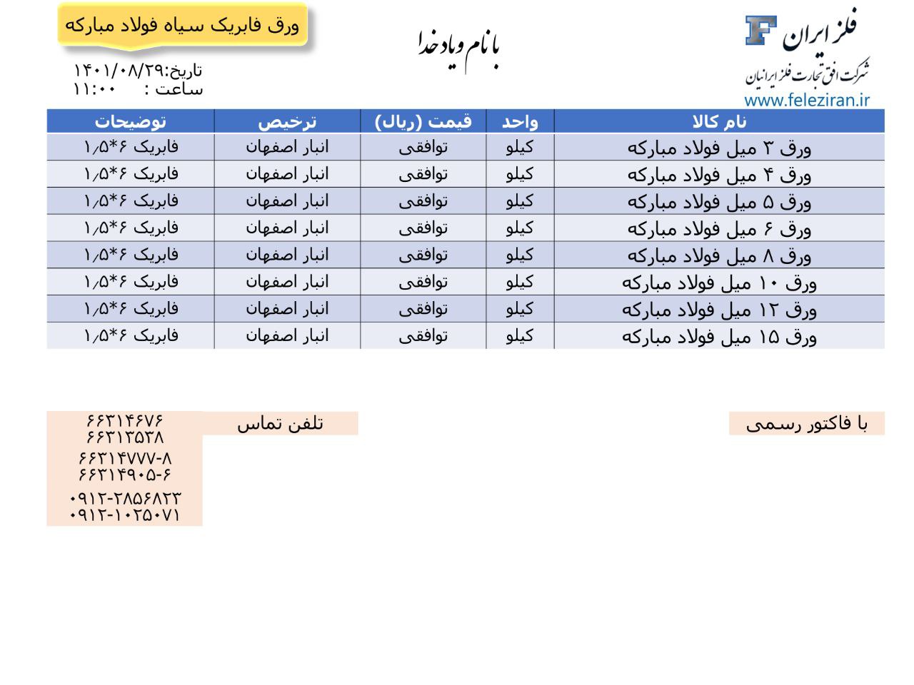 لیست موجودی ورق فابریک سیاه فولاد مبارکه